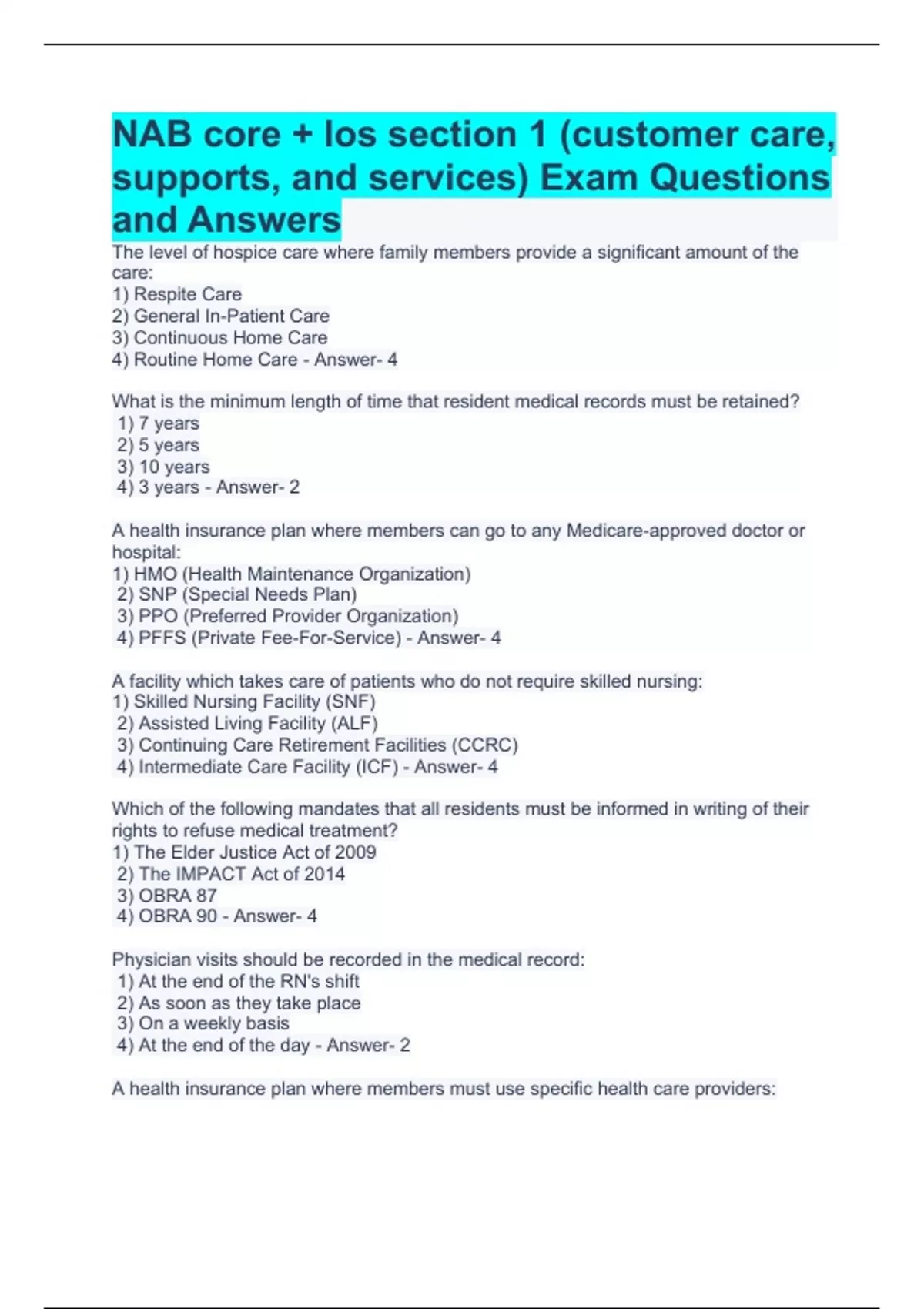 NAB core + los section 1 (customer care, supports, and services) Exam Questions and Answers