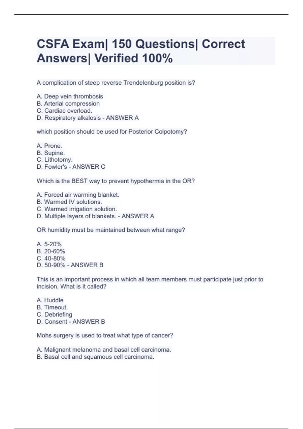A complication of steep reverse Trendelenburg position is? A. Deep vein thrombosis B. Arterial compression C. Cardiac overload. D. Respiratory alkalosis - ANSWER A which position should be used for Posterior Colpotomy? A. Prone. B. Supine. C. Lithotomy. D. Fowler's - ANSWER C Which is the BEST way to prevent hypothermia in the OR? A. Forced air warming blanket. B. Warmed IV solutions. C. Warmed irrigation solution. D. Multiple layers of blankets. - ANSWER A OR humidity must be maintained between what range? A. 5-20% B. 20-60% C. 40-80% D. 50-90% - ANSWER B This is an important process in which all team members must participate just prior to incision. What is it called? A. Huddle B. Timeout. C. Debriefing D. Consent - ANSWER B Mohs surgery is used to treat what type of cancer? A. Malignant melanoma and basal cell carcinoma. B. Basal cell and squamous cell carcinoma. C. Malignant melanoma and squamo
