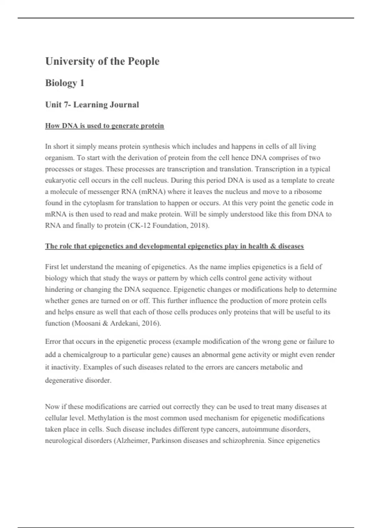 In short it simply means protein synthesis which includes and happens in cells of all living organism. To start with the derivation of protein from the cell hence DNA comprises of two processes or stages. These processes are transcription and translation. Transcription in a typical eukaryotic cell occurs in the cell nucleus. During this period DNA is used as a template to create a molecule of messenger RNA (mRNA) where it leaves the nucleus and move to a ribosome found in the cytoplasm for translation to happen or occurs. At this very point the genetic code in mRNA is then used to read and make protein. Will be simply understood like this from DNA to RNA and finally to protein (CK-12 Foundation, 2018).