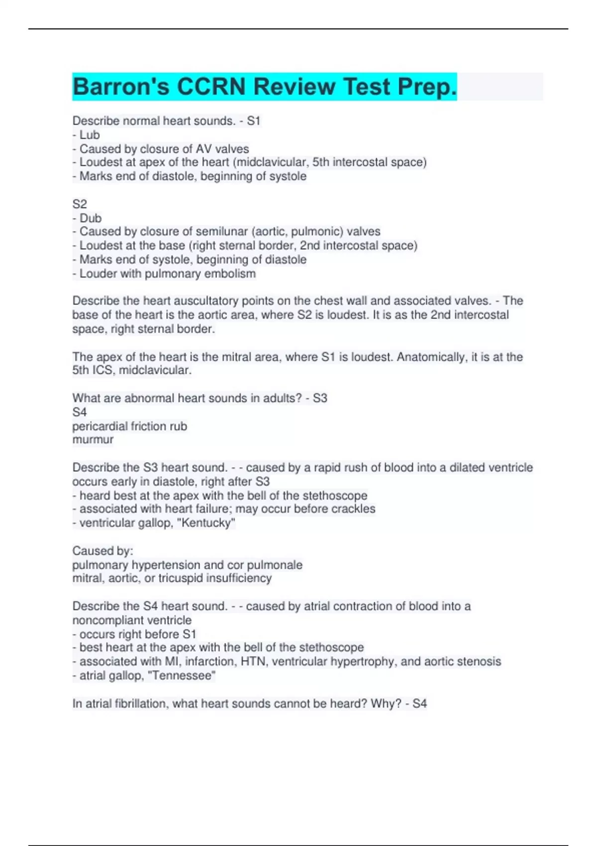 Barron's CCRN Review Test Prep. Describe normal heart sounds. - S1 - Lub - Caused by closure of AV valves - Loudest at apex of the heart (midclavicular, 5th intercostal space) - Marks end of diastole, beginning of systole S2 - Dub - Caused by closure of semilunar (aortic, pulmonic) valves - Loudest at the base (right sternal border, 2nd intercostal space) - Marks end of systole, beginning of diastole - Louder with pulmonary embolism Describe the heart auscultatory points on the chest wall and associated valves. - The base of the heart is the aortic area, where S2 is loudest. It is as the 2nd intercostal space, right sternal border. The apex of the heart is the mitral area, where S1 is loudest. Anatomically, it is at the 5th ICS, midclavicular. What are abnormal heart sounds in adults? - S3 S4 pericardial friction rub murmur Describe the S3 heart sound. - - caused by a rapid rush of blood into a dilated ventricle occurs early in diastole, right after S3 - heard best at the apex with the bell of the stethoscope - associated with heart failure; may occur before crackles - ventricular gallop, "Kentucky" Caused by: pulmonary hypertension and cor pulmonale mitral, aortic, or tricuspid insufficiency Describe the S4 heart sound. - - caused by atrial contraction of blood into a noncompliant ventricle - occurs right before S1 - best heart at the apex with the bell of the stethoscope - associated with MI, infarction, HTN, ventricular hypertrophy, and aortic stenosis - atrial gallop, "Tennessee" In atrial fibrillation, what heart sounds cannot be heard? Why? - S4 There is no atrial contraction. What is the formula for pulse pressure? What is a normal value