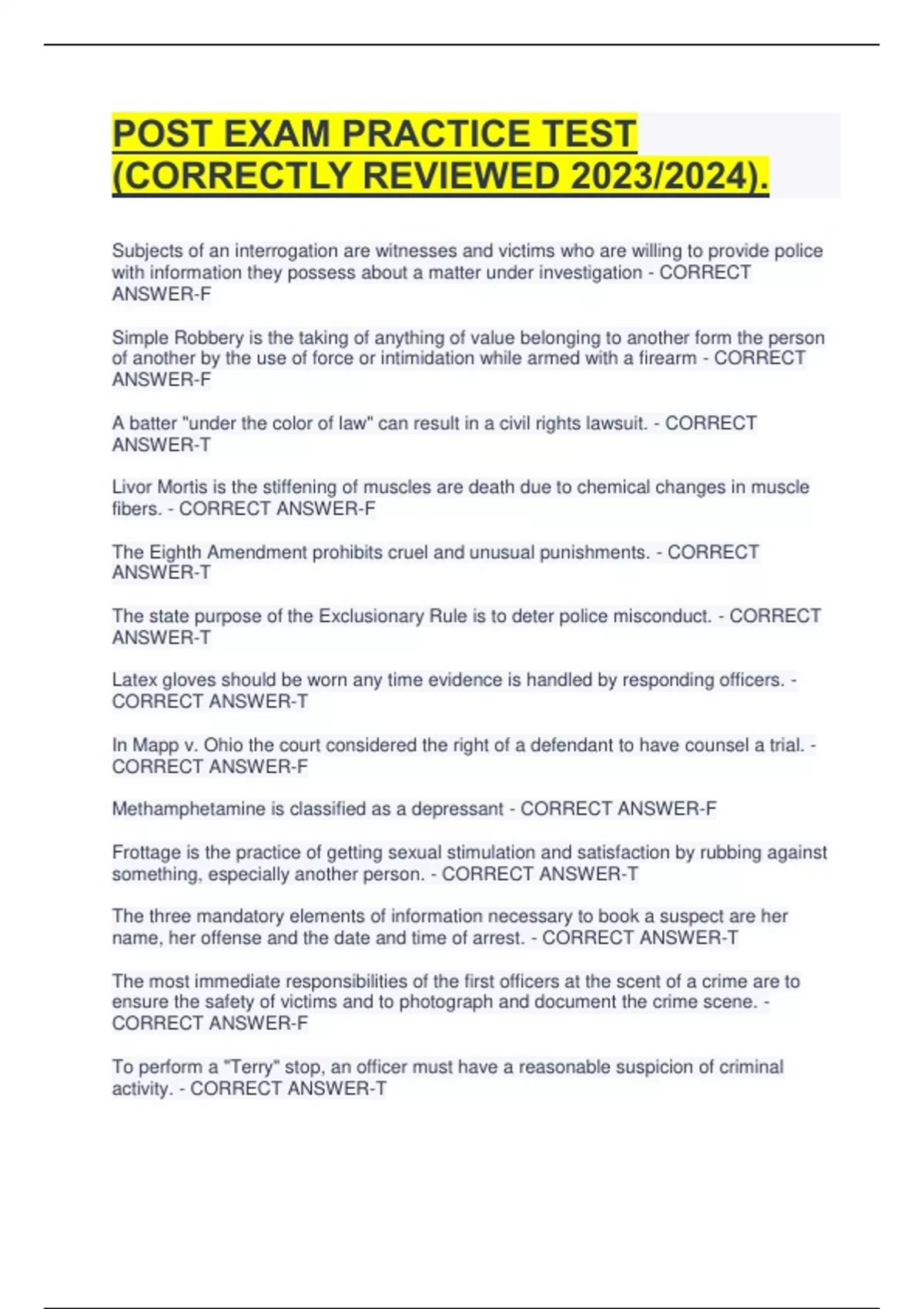 POST EXAM PRACTICE TEST (CORRECTLY REVIEWED 2023/2024). Subjects of an interrogation are witnesses and victims who are willing to provide police with information they possess about a matter under investigation - CORRECT ANSWER-F Simple Robbery is the taking of anything of value belonging to another form the person of another by the use of force or intimidation while armed with a firearm - CORRECT ANSWER-F A batter "under the color of law" can result in a civil rights lawsuit. - CORRECT ANSWER-T Livor Mortis is the stiffening of muscles are death due to chemical changes in muscle fibers. - CORRECT ANSWER-F The Eighth Amendment prohibits cruel and unusual punishments. - CORRECT ANSWER-T The state purpose of the Exclusionary Rule is to deter police misconduct. - CORRECT ANSWER-T Latex gloves should be worn any time evidence is handled by responding officers. - CORRECT ANSWER-T In Mapp v. Ohio the court considered the right of a defendant to have counsel a trial. - CORRECT ANSWER-F Methamphetamine is classified as a depressant - CORRECT ANSWER-F Frottage is the practice of getting sexual stimulation and satisfaction by rubbing against something, especially another person. - CORRECT ANSWER-T The three mandatory elements of information necessary to book a suspect are her name, her offense and the date and time of arrest. - CORRECT ANSWER-T The most immediate responsibilities of the first officers at the scent of a crime are to ensure the safety of victims and to photograph and document the crime scene. - CORRECT ANSWER-F To perform a "Terry" stop, an officer must have a reasonable suspicion of criminal activity. - CORRECT ANSWER-T Criminal conspiracy and committing a felony are called "inchoate" offenses. - CORRECT ANSWER-F Two functions of motorized patrol units are to deter crime and to promote the public's feeling of safety. - CORRECT ANSWER-T Forcible Rape is committed when the victim is incapable of resisting or is incapable of understanding the nature of the act by reason of stupor or other abnormal condition of the mind. - CORRECT ANSWER-T An officer conducting a "frisk" may also "pat down" things (backpacks, purse or duffle bags) carried by the suspect. - CORRECT ANSWER-T The condition of a vehicle's tires has little effect on the overall stopping distance of a police car. - CORRECT ANSWER-F A police officer's cultural background and physiological make-up are major influences in how he perceives people he come into contact with. - CORRECT ANSWER-T The "Bill of Rights" Consist of the first fourteen amendments to the U.S. Constitution . - CORRECT ANSWER-F Cocaine is a schedule I drug. - CORRECT ANSWER-F The three components of the criminal justice system are the police, courts and corrections. - CORRECT ANSWER-T An "unknown risk" stop is one in which an officer suspects the violence potential of the driver may be high. - CORRECT ANSWER-F Upon arrival at a crime scene, responding officers must immediately ensure that the scene is safe. - CORRECT ANSWER-T THe three