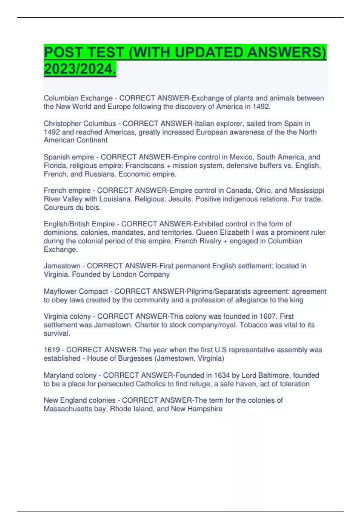 POST TEST (WITH UPDATED ANSWERS) 2023/2024. Columbian Exchange - CORRECT ANSWER-Exchange of plants and animals between the New World and Europe following the discovery of America in 1492. Christopher Columbus - CORRECT ANSWER-Italian explorer, sailed from Spain in 1492 and reached Americas, greatly increased European awareness of the the North American Continent Spanish empire - CORRECT ANSWER-Empire control in Mexico, South America, and Florida, religious empire; Franciscans + mission system, defensive buffers vs. English, French, and Russians. Economic empire. French empire - CORRECT ANSWER-Empire control in Canada, Ohio, and Mississippi River Valley with Louisiana. Religious: Jesuits. Positive indigenous relations. Fur trade. Coureurs du bois. English/British Empire - CORRECT ANSWER-Exhibited control in the form of dominions, colonies, mandates, and territories. Queen Elizabeth I was a prominent ruler during the colonial period of this empire. French Rivalry + engaged in Columbian Exchange. Jamestown - CORRECT ANSWER-First permanent English settlement; located in Virginia. Founded by London Company Mayflower Compact - CORRECT ANSWER-Pilgrims/Separatists agreement: agreement to obey laws created by the community and a profession of allegiance to the king Virginia colony - CORRECT ANSWER-This colony was founded in 1607. First settlement was Jamestown. Charter to stock company/royal. Tobacco was vital to its survival. 1619 - CORRECT ANSWER-The year when the first U.S representative assembly was established - House of Burgesses (Jamestown, Virginia) Maryland colony - CORRECT ANSWER-Founded in 1634 by Lord Baltimore, founded to be a place for persecuted Catholics to find refuge, a safe haven, act of toleration New England colonies - CORRECT ANSWER-The term for the colonies of Massachusetts bay, Rhode Island, and New Hampshire Massachusetts Bay Colony - CORRECT ANSWER-Colony founded in 1630 by John Winthrop, part of the Great Puritan Migration, founded by puritans. Had a theocratic republic. "City upon a hill" Anne Hutchinson - CORRECT ANSWER-Woman who challenged Purtian religous authorities in Massachusetts Bay. Puritan authorities banished her because she challenged religious doctrine, gender roles. clerical authority, and claimed to have had revelations from God Salem Witch Trials - CORRECT ANSWER-1629 outbreak of witchcraft accusations in a Massachussets Bay puritan village marked by an atmosphere of fear, hysteria and stress. Spectral evidence was used frequently. Rhode Island Colony - CORRECT ANSWER-Self-governing colony founded by Roger Williams in 1636; granted freedom for all religions and non-believers; religious toleration; disestablishment, universal suffrage for white males w/property qualifications; most democratic Disestablishment - CORRECT ANSWER-Separation of church and state; no religion is officially supported by the state/government; opposed tax-supported church William Penn - CORRECT ANSWER-An English Quaker, founded Pennsylvania in 1682, after receiving a charter from King Charles II the year before. He launched the colony as a "holy experiment" based on religious tolerance. Mercantilism - CORRECT ANSWER-Economic philosophy of 17th and 18th century European nations; sought to increase wealth and power through acquisition of gold and silver and establishing a favorable balance of trade. Colonies served interest of mother country through importation of its raw materials -> Exportation > importation Triangular trade - CORRECT ANSWER-Trading System between Europe,