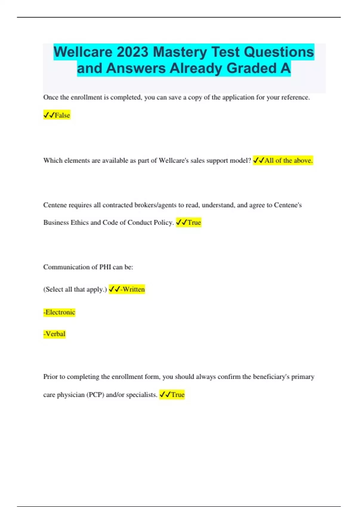 Wellcare 2023 Mastery Test Questions and Answers Already Graded A Once the enrollment is completed, you can save a copy of the application for your reference. False Which elements are available as part of Wellcare's sales support model? All of the above. Centene requires all contracted brokers/agents to read, understand, and agree to Centene's Business Ethics and Code of Conduct Policy. True Communication of PHI can be: (Select all that apply.) -Written -Electronic -Verbal Prior to completing the enrollment form, you should always confirm the beneficiary's primary care physician (PCP) and/or specialists. True Noting the correct enrollment period on enrollment applications helps in preventing delayed enrollment processing. Select one: True A Health Risk Assessment (HRA) can be completed for C-SNP and D-SNP plans only, before the enrollment application process in Ascend through the Value Based Enrollment (VBE) portal. False Beneficiary-facing content that includes generic or plan-specific product or benefit information must be submitted for review and CMS submission, as well as acceptance or approval, prior to distribution. True A broker/agent who has never had any verbal warnings cannot be issued a Corrective Action Plan. False The NEW online Centene Workbench self-service portal enables you to: All of the above What are some examples of what can trigger a beneficiary complaint? Select All! a.Did not consent to enroll in the plan. b.Received incorrect plan benefit information or were dissatisfied with plan benefits. c.Had enrollment/disenrollment issues (e.g., disenrollment/cancellation requests, late enrollment penalty, loss of entitlement). d.Were misled about which providers were in-network. Member PHI can be stored on an external hard drive or a cloud storage service like Google Drive or Apple Cloud. False What type of inquiries can Wellcare's Corporate Sales Support team assist with? All of the above Which of the following actions are you required to do when contacted regarding an allegation of noncompliant activity? All of the above Ascend is a fast, easy, and compliant way for brokers/agents to submit agent-assisted electronic enrollments. True Key areas you as a broker/agent have control over and impact upon regarding Star Ratings for quality are: All of the above Low-Income Subsidy (LIS)/Medicaid Lookup status verification in Ascend is: Select All! a.Available for LIS level searches in all states. b.Available for Medicaid status searches in select states. c.A way to assist brokers/agents with enrolling beneficiaries into the right plan based on their extra help status. The beneficiary (or their authorized representative) must indicate the product types to be discussed during the appointment on the Scope of Appointment (SOA). True Value Script and Value Plus PDP products have a ___-tier formulary structure for 2023. 6 The Wellcare preferred pharmacy network includes Walgreens, CVS, and many grocery chains in 2023. True All PDPs will continue to offer $0 tier 1 preferred cost-sharing through CVS Medication Home Delivery (Mail Order). True The Part D Senior Savings Model (SSM), which reduces member spending on insulin, will be offered on all Value Script, Value Plus PDPs, and select Wellcare MAPD plans. True Centene's 2023 product expansion represents a __% increase from 2022. 3 For 2023, Ascension Complete added 27 new counties to their footprint. True Which standalone Prescription Drug Plan is best for a dual-eligible chooser? Classic For PDP Medication Home Delivery, the ____ plan will continue to offer a discount for 90-day tier 2, tier 3 and tier 6 prescriptions. Value Plus ____ PDPs will be offered across all 50 U.S. states and Washington, D.C. Three ____ PDPs will be offered across all 50 U.S. states and Washington, D.C. True All PDPs will feature a $0 tier 1 benefit when filled at preferred pharmacies. True Wellcare added ___ counties to their footprint for 2023. 209