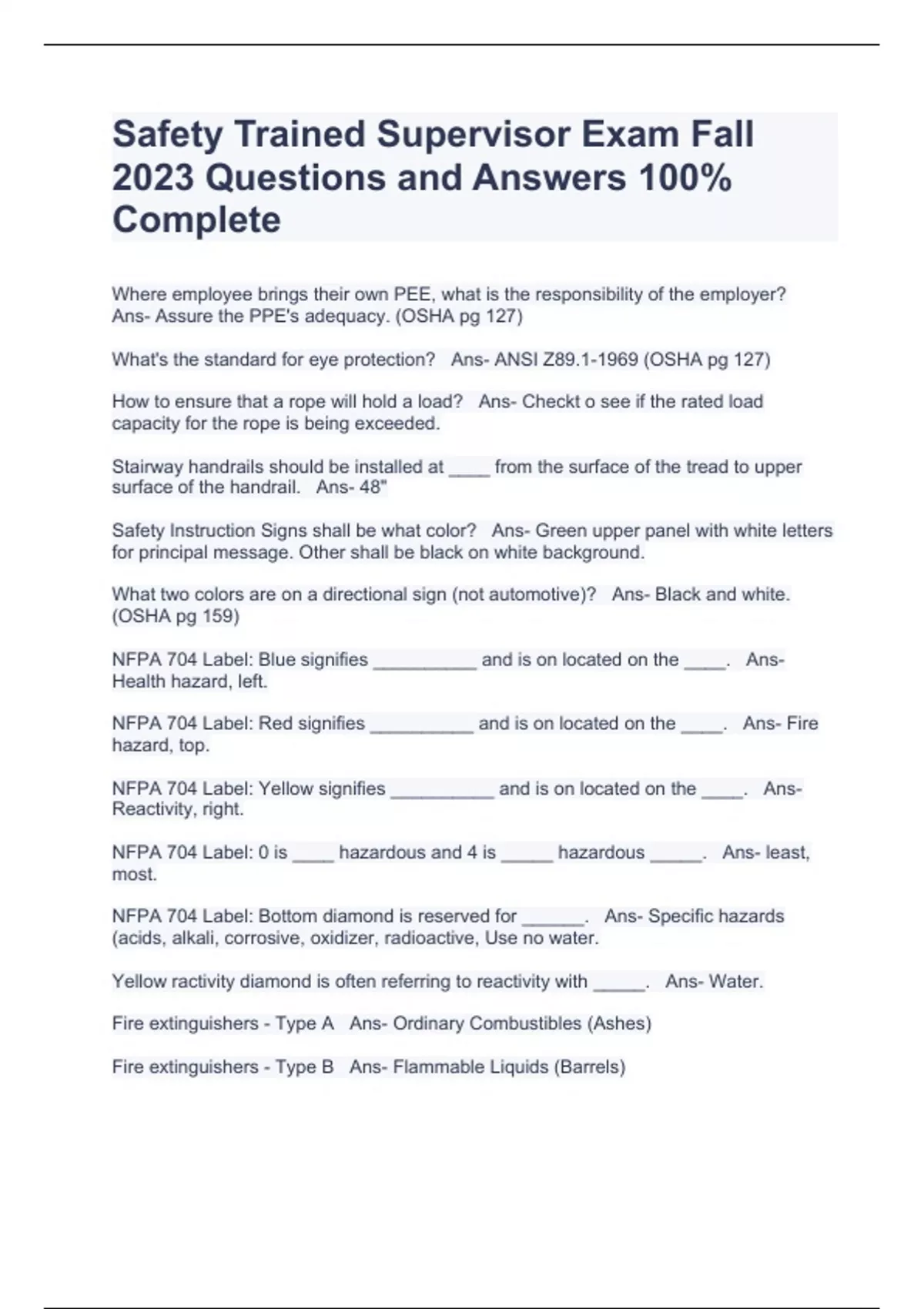 Safety Trained Supervisor Exam Fall 2023 Questions and Answers 100% Complete