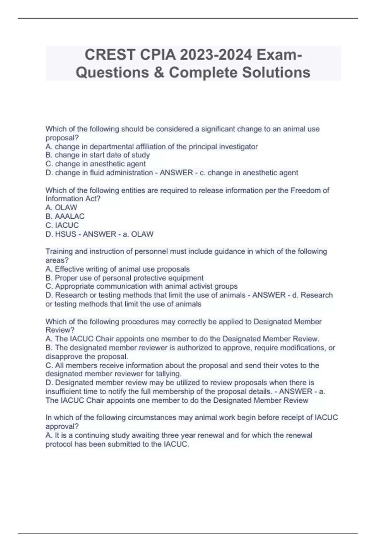 CREST CPIA Exam- Questions & Complete SolutionsCREST CPIA Exam- Questions & Complete SolutionsCREST CPIA Exam- Questions & Complete SolutionsCREST CPIA Exam- Questions & Complete Solutions Which of the following should be considered a significant change to an animal use proposal? A. change in departmental affiliation of the principal investigator B. change in start date of study C. change in anesthetic agent D. change in fluid administration - ANSWER - c. change in anesthetic agent Which of the following entities are required to release information per the Freedom of Information Act? A. OLAW B. AAALAC C. IACUC D. HSUS - ANSWER - a. OLAW Training and instruction of personnel must include guidance in which of the following areas? A. Effective writing of animal use proposals B. Proper use of personal protective equipment C. Appropriate communication with animal activist groups D. Research or testing methods that limit the use of animals - ANSWER - d. Research or testing methods that limit the use of animals Which of the following procedures may correctly be applied to Designated Member Review? A. The IACUC Chair appoints one member to do the Designated Member Review. B. The designated member reviewer is authorized to approve, require modifications, or disapprove the proposal. C. All members receive information about the proposal and send their votes to the designated member reviewer for tallying. D. Designated member review may be utilized to review proposals when there is insufficient time to notify the full membership of the proposal details. - ANSWER - a. The IACUC Chair appoints one member to do the Designated Member Review In which of the following circumstances may animal work begin before receipt of IACUC approval?