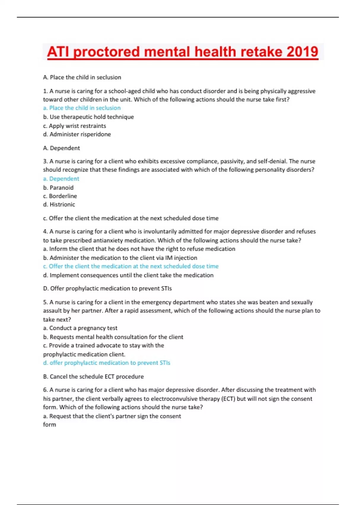 ATI proctored mental health retake 2019 A. Place the child in seclusion 1. A nurse is caring for a school-aged child who has conduct disorder and is being physically aggressive toward other children in the unit. Which of the following actions should the nurse take first? a. Place the child in seclusion b. Use therapeutic hold technique c. Apply wrist restraints d. Administer risperidone A. Dependent 3. A nurse is caring for a client who exhibits excessive compliance, passivity, and self-denial. The nurse should recognize that these findings are associated with which of the following personality disorders? a. Dependent b. Paranoid c. Borderline d. Histrionic c. Offer the client the medication at the next scheduled dose time 4. A nurse is caring for a client who is involuntarily admitted for major depressive disorder and refuses to take prescribed antianxiety medication. Which of the following actions should the nurse take? a. Inform the client that he does not have the right to refuse medication b. Administer the medication to the client via IM injection c. Offer the client the medication at the next scheduled dose time d. Implement consequences until the client take the medication D. Offer prophylactic medication to prevent STIs 5. A nurse is caring for a client in the emergency department who states she was beaten and sexually assault by her partner. After a rapid assessment, which of the following actions should the nurse plan to take next? a. Conduct a pregnancy test b. Requests mental health consultation for the client c. Provide a trained advocate to stay with the prophylactic medication client. d. offer prophylactic medication to prevent STIs B. Cancel the schedule ECT procedure 6. A nurse is caring for a client who has major depressive disorder. After discussing the treatment with his partner, the client verbally agrees to electroconvulsive therapy (ECT) but will not sign the consent form. Which of the following actions should the nurse take? a. Request that the client's partner sign the consent form b. Cancel the schedule ECT procedure c. Proceed with the preparation for ECT based on implied consent d. Inform the client about the risks of refusing the ECT d. Displacement 7. A nurse is caring for a client who reports that he is angry with his partner because she thinks he is just trying to gain attention. When the nurse attempts to talk to the client, he becomes angry and tells her to leave. Which of the following defense mechanisms is the client demonstrating? a. Rationalization b. Denial c. Compensation d. Displacement b. It's important that the client feel safe verbalizing how she is feeling 8. A nursing is advising an assistive personnel (AP) on the care of a client who has major depressive disorder. The AP states that he is irritated by the client's depression. Which of the following statements by the nurse is appropriate? a. Please don't take what the client said seriously when she is depressed b. It's important that the client feel safe verbalizing how she is feeling c. Everybody feels that way about this client so don't worry about it d. I'll change your assignment to someone who doesn't have depressive disorder d. The child has cystic fibrosis 9. A nurse is assessing a child in the emergency department. Which of the following findings places the child at the greatest risk for physical abuse? a. The child is 10years old b. The child is homeschooled c. The has no siblings d. The child has cystic fibrosis b. Snap a rubber band on your wrist when you think about checking the locks 10. A nurse Is providing behavioral therapy for a client who has obsessive-compulsive disorder.The client repeatedly checks that the doors are locked at night. Which of the following instructions should the nurse give the client when using thought stopping technique? a. Keep a journal of how often you check the locks each night b. Snap a rubber band on your wrist when you think about checking the locks c. Ask a family member to check the lock for you at night d. Focus on abdominal breathing whenever you go to check the locks d. Hypertension 11. A nurse is assessing a client who is experiencing alcohol withdrawal.For which of the following findings should the nurse anticipate administration of lorazepam/ a. Bradycardia b. Stupor c. Afebrile d. Hypertension d. Encourage the client to participate in family therapy 12. A nurse is creating a plan of care of a client who has anorexia nervosa.Which of the following intervention should the nurse include in the plan? a. Weigh the client twice per day b. Prepare the client for electroconvulsive therapy c. Set a weight gain goal of 2.2kg (5lbs) per week d. Encourage the client to participate in family therapy d. Attachment to objects that spin 13. A nurse is planning care for a 3-year-old child who has autism spectrum disorder. Which of the following finding should the nurse expect? a. Readily initiates conversation b. Enjoys imaginative play c. Strong relationship with sibling and peers d. Attachment to objects that spin b. Limit loud noises in the client's environment 14. A nurse is planning care for a client who has bipolar disorder. The client reports not sleeping for 3 days and is exhibiting a euphoric mood. The nurse should identify which of the following as the priority intervention. a. Secure the client's valuable possessions b. Limit loud noises in the client's environment c. Encourage the client to participate in structured solitary activities d. Provide high calorie snacks to the client c. Reduce substance craving 15. A nurse is evaluating the medication response of a client who takes naltrexone for the treatment of alcohol use disorder. The nurse should identify that which of the following is a therapeutic effect of this medication. a. Blocks aldehyde dehydrogenase b. Prevents the anxiety of abstinence c. Reduce substance craving d. Decreases the likelihood of seizures b. Rationalization 16. A nurse in an alcohol treatment facility is caring for a 