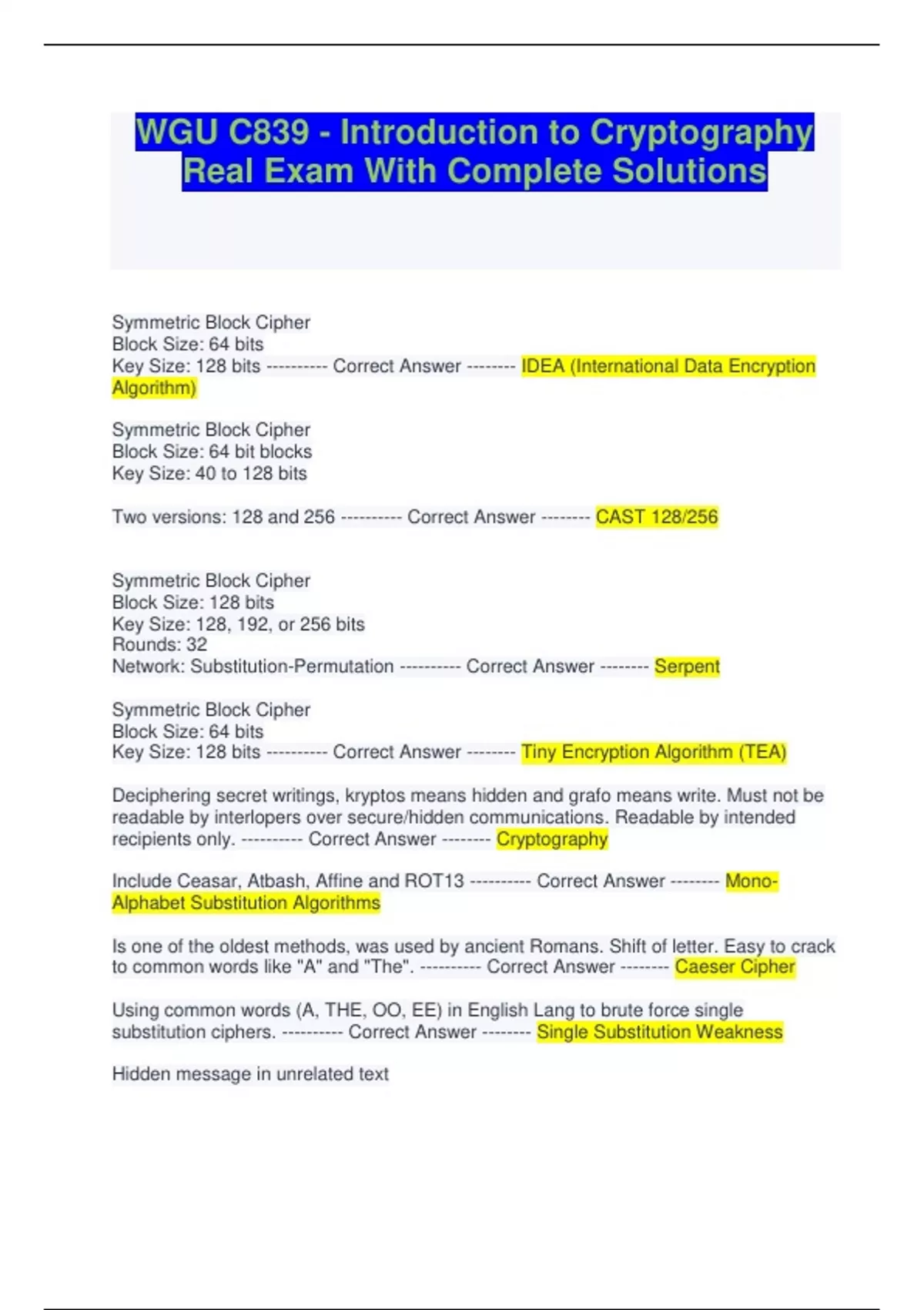 WGU C839 - Introduction to Cryptography Real Exam With Complete Solutions Symmetric Block Cipher Block Size: 64 bits Key Size: 128 bits ---------- Correct Answer -------- IDEA (International Data Encryption Algorithm) Symmetric Block Cipher Block Size: 64 bit blocks Key Size: 40 to 128 bits Two versions: 128 and 256 ---------- Correct Answer -------- CAST 128/256 Symmetric Block Cipher Block Size: 128 bits Key Size: 128, 192, or 256 bits Rounds: 32 Network: Substitution-Permutation ---------- Correct Answer -------- Serpent Symmetric Block Cipher Block Size: 64 bits Key Size: 128 bits ---------- Correct Answer -------- Tiny Encryption Algorithm (TEA) Deciphering secret writings, kryptos means hidden and grafo means write. Must not be readable by interlopers over secure/hidden communications. Readable by intended recipients only. ---------- Correct Answer -------- Cryptography Include Ceasar, Atbash, Affine and ROT13 ---------- Correct Answer -------- MonoAlphabet Substitution Algorithms Is one of the oldest methods, was used by ancient Romans. Shift of letter. Easy to crack to common words like "A" and "The". ---------- Correct Answer -------- Caeser Cipher Using common words (A, THE, OO, EE) in English Lang to brute force single substitution ciphers. ---------- Correct Answer -------- Single Substitution Weakness Hidden message in unrelated text • The sender and recipient have prearranged to use some pattern, taking certain letters from the message. ---------- Correct Answer -------- Null Cipher Parties agree on a particular book. Simplest implementation to send coordinates for words ---------- Correct Answer -------- Book Cipher Widely known Transposition cipher. Plaintext written in columns and transposed in rows. Recipient reconstructs the original message ---------- Correct Answer -------- Rail Fence Cipher Substitution (XOR the PT with key) and transposition (swapping blocks of text) ---------- Correct Answer -------- Symmetric Key Cryptography uses two processes Symmetric Block Cipher Block Size: 64 bit Key Size: 56 bit Rounds: 16 rounds Feistel cipher ---------- Correct Answer -------- DES (Data Encryption Standard)