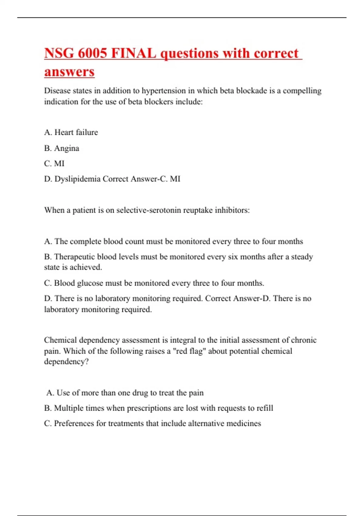 Disease states in addition to hypertension in which beta blockade is a compelling indication for the use of beta blockers include: A. Heart failure B. Angina C. MI D. Dyslipidemia Correct Answer-C. MI When a patient is on selective-serotonin reuptake inhibitors: A. The complete blood count must be monitored every three to four months B. Therapeutic blood levels must be monitored every six months after a steady state is achieved. C. Blood glucose must be monitored every three to four months. D. There is no laboratory monitoring required. Correct Answer-D. There is no laboratory monitoring required. Chemical dependency assessment is integral to the initial assessment of chronic pain. Which of the following raises a "red flag" about potential chemical dependency?