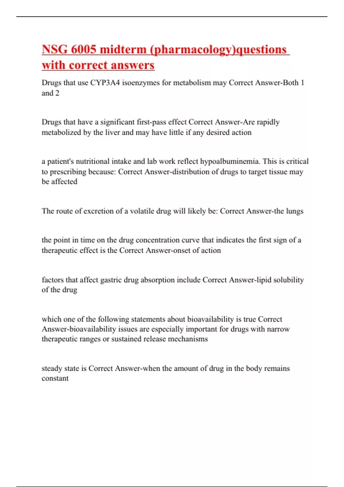 Drugs that use CYP3A4 isoenzymes for metabolism may Correct Answer-Both 1 and 2 Drugs that have a significant first-pass effect Correct Answer-Are rapidly metabolized by the liver and may have little if any desired action a patient's nutritional intake and lab work reflect hypoalbuminemia. This is critical to prescribing because: Correct Answer-distribution of drugs to target tissue may be affected The route of excretion of a volatile drug will likely be: Correct Answer-the lungs the point in time on the drug concentration curve that indicates the first sign of a therapeutic effect is the Correct Answer-onset of action factors that affect gastric drug absorption include Correct Answer-lipid solubility of the drug which one of the following statements about bioavailability is true Correct Answer-bioavailability issues are especially important for drugs with narrow therapeutic ranges or sustained release mechanisms