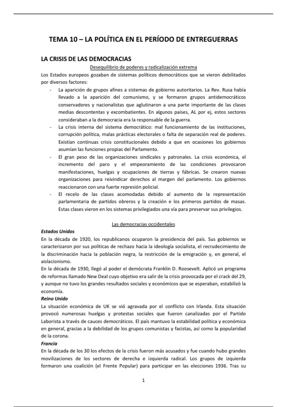 TEMA 10 – LA POLÍTICA EN EL PERÍODO DE ENTREGUERRAS