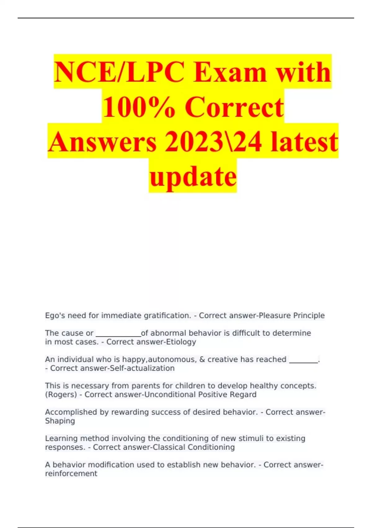 NCE/LPC Exam with 100% Correct Answers 202324 latest update