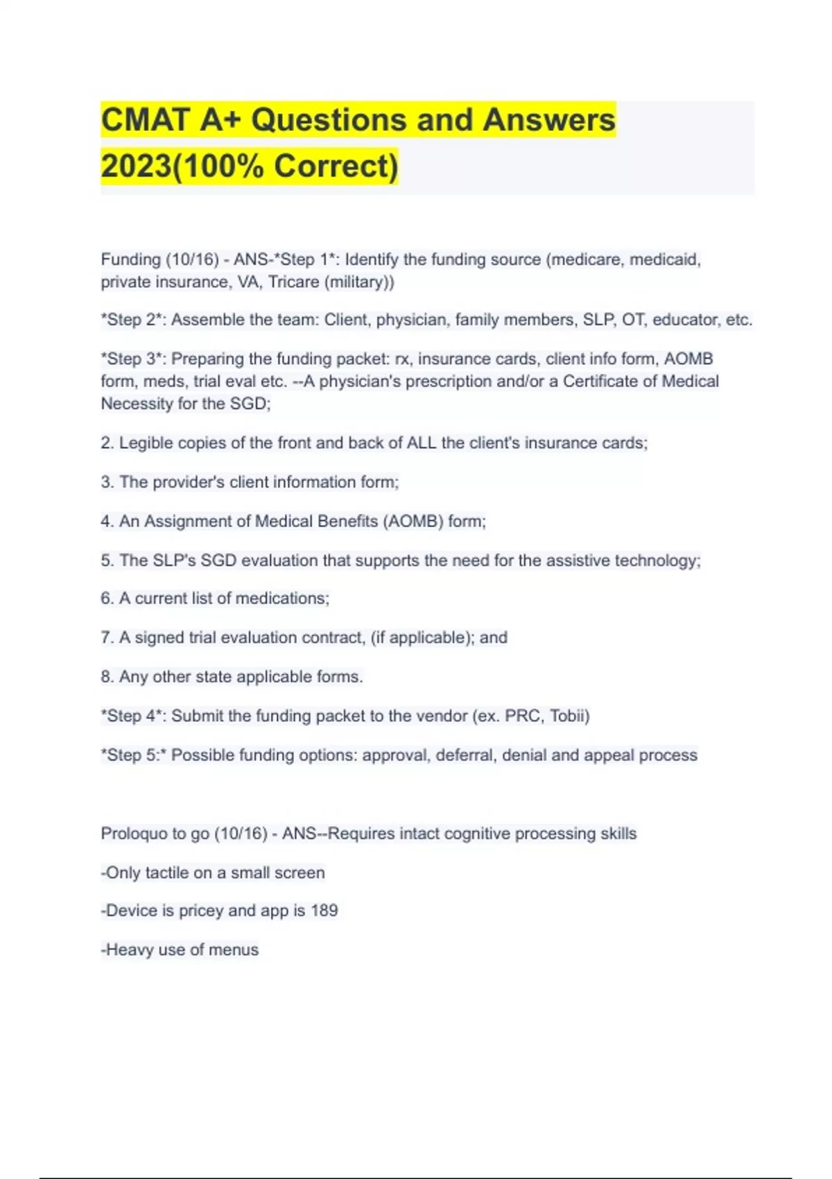 CMAT A+ Questions and Answers 2023(100% Correct) Funding (10/16) - ANS-*Step 1*: Identify the funding source (medicare, medicaid, private insurance, VA, Tricare (military)) *Step 2*: Assemble the team: Client, physician, family members, SLP, OT, educator, etc. *Step 3*: Preparing the funding packet: rx, insurance cards, client info form, AOMB form, meds, trial eval etc. --A physician's prescription and/or a Certificate of Medical Necessity for the SGD; 2. Legible copies of the front and back of ALL the client's insurance cards; 3. The provider's client information form; 4. An Assignment of Medical Benefits (AOMB) form; 5. The SLP's SGD evaluation that supports the need for the assistive technology; 6. A current list of medications; 7. A signed trial evaluation contract, (if applicable); and 8. Any other state applicable forms. *Step 4*: Submit the funding packet to the vendor (ex. PRC, Tobii) *Step 5:* Possible funding options: approval, deferral, denial and appeal process Proloquo to go (10/16) - ANS--Requires intact cognitive processing skills -Only tactile on a small screen -Device is pricey and app is 189 -Heavy use of menus -Not a large amount of programming