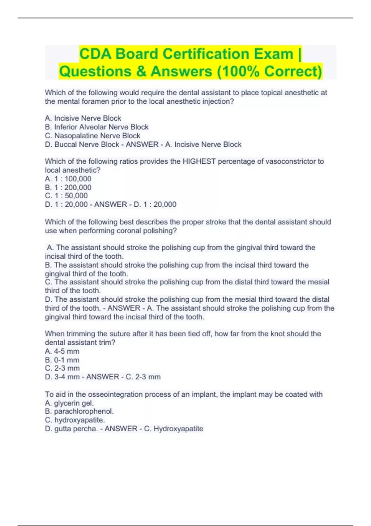 CDA Board Certification Exam | Questions & Answers (100% Correct) CDA Board Certification Exam | Questions & Answers (100% Correct) Which of the following would require the dental assistant to place topical anesthetic at the mental foramen prior to the local anesthetic injection? A. Incisive Nerve Block B. Inferior Alveolar Nerve Block C. Nasopalatine Nerve Block D. Buccal Nerve Block - ANSWER - A. Incisive Nerve Block Which of the following ratios provides the HIGHEST percentage of vasoconstrictor to local anesthetic? A. 1 : 100,000 B. 1 : 200,000 C. 1 : 50,000 D. 1 : 20,000 - ANSWER - D. 1 : 20,000 Which of the following best describes the proper stroke that the dental assistant should use when performing coronal polishing? A. The assistant should stroke the polishing cup from the gingival third toward the incisal third of the tooth. B. The assistant should stroke the polishing cup from the incisal third toward the gingival third of the tooth. C. The assistant should stroke the polishing cup from the distal third toward the mesial third of the tooth. D. The assistant should stroke the polishing cup from the mesial third toward the distal third of the tooth. - ANSWER - A. The assistant should stroke the polishing cup from the gingival third toward the incisal third of the tooth. When trimming the suture after it has been tied off, how far from the knot should the dental assistant trim? A. 4-5 mm B. 0-1 mm C. 2-3 mm D. 3-4 mm - ANSWER - C. 2-3 mm To aid in the osseointegration process of an implant, the implant may be coated with A. glycerin gel. B. parachlorophenol. C. hydroxyapatite. D. gutta percha. - ANSWER - C. Hydroxyapatite Which of the following would MOST LIKELY be selected to place retention grooves within a cavity preparation? A. 557 bur B. 35 bur C. 8 bur D. 169 bur - ANSWER - B. 35 Bur Which of the following instrument grasps will the dentist utilize when holding #151 extraction forceps? A. A palm-thumb grasp B. A pen grasp C. A palm grasp D. A reverse palm-thumb grasp - ANSWER - C. A palm grasp The dental assistant is taking a final impression for a maxillary denture. Which of the following anatomical landmarks does NOT need to be included? A. Post dam B. Frenum attachments C. Hamular notches D. Genial tubercles - ANSWER - D. Genial tubercles When assisting in a Class III or IV composite restorative procedure, what is the best type of matrix that should be used? A. Auto matrix B. Clear matrix C. Universal retainer D. T-band - ANSWER - B. Clear Matrix When curing a composite, the curing light tip should be held at a A. 45-degree angle to the tooth. B. 90-degree angle to the tooth. C. 10-degree angle to the tooth. D. 20-degree angle to the tooth. - ANSWER - B. 90-degree angle held to the tooth Which of the following charting symbols indicates that tooth #16 is impacted? A. Tooth #16 has a blue "X" marked through the tooth. B. Tooth #16 has the canal area filled in with blue. C. Tooth #16 has a red jagged line through the root. D. Tooth #16 has a red circle around the entire tooth. - ANSWER - D. Tooth #16 has a red circle around the entire tooth. When evaluating a patient's bite, which of the following describes the sliding of the mandible to the left or right? A. Retrusion B. Protrusion C. Centric relation D. Lateral excursion - ANSWER - D. Lateral excursion