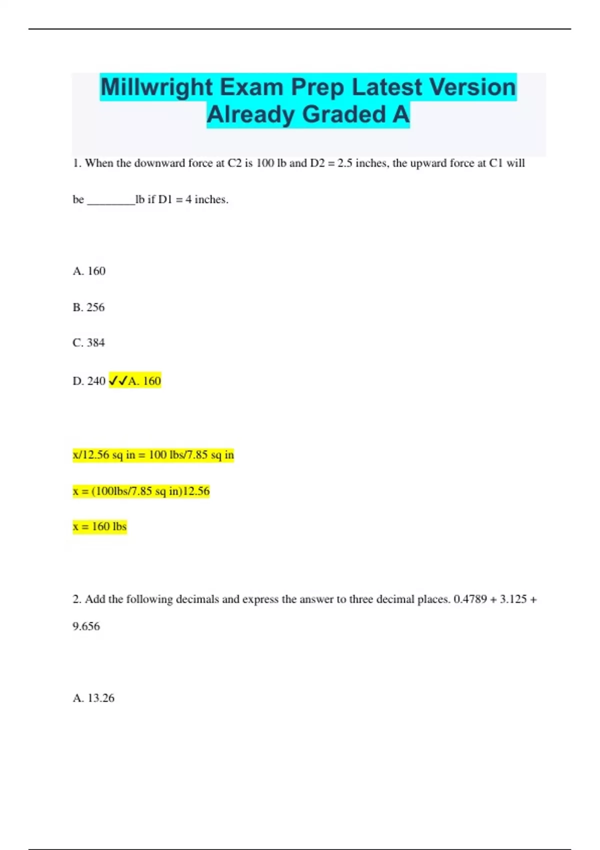 Millwright Exam Prep Latest Version Already Graded A 1. When the downward force at C2 is 100 lb and D2 = 2.5 inches, the upward force at C1 will be ________lb if D1 = 4 inches. A. 160 B. 256 C. 384 D. 240 A. 160 x/12.56 sq in = 100 lbs/7.85 sq in x = (100lbs/7.85 sq in)12.56 x = 160 lbs 2. Add the following decimals and express the answer to three decimal places. 0.4789 + 3.125 + 9.656 A. 13.26 B. 13.3 C. 13.259 D. 13.2599 C. 13.259 3. What are common materials used as electrical conductors? A. Silver, copper, aluminum B. Copper, glass, lead C. Mica, rubber, titanium D. Gold, copper, mica A. Silver, copper, aluminum 4. Large impulse turbines will use what of rotor? A. Build-up rotors. B. Solid rotors C. Combination of solid and build-up rotors D. All of the above D. All of the above 5. The most effect purging medium to use when dealing with iron sulphide is: A. air B. carbon dioxide C. nitrogen D. water D. water 6. The shape of a ball bearing is ______ when a load is applied to the ball. A. elliptical B. circular C. rectangle D. radial E. trapezoid A. elliptical 7. Which of the following is a typical 4000 hour inspection duty with compressors? A. Service the crankcase breather B. Take oil samples C. Recalibrate all temperature and pressure gauges D. Check gas discharge and inlet temperatures A. Service the crankcase breather 8. What does the term nominal filter refer to? A. A ratio of large to small particles found in a test run. B. The largest particle that will pass through the filter under specific test conditions C. The length of time a filter is functional based on particle tests. D. That a stated percentage of a certain size particle will be stopped D. That a stated percentage of a certain size particle will be stopped 9. Which of the following best defines a breaker fabric? A. An open mesh used to reinforce against longitudinal breaking under impact B. A single layer of fabric that provides load support C. The traverse yarns that run perpendicular to the warp yarns D. Yarns in the fabric that provide the tension strength E. An extra layer of rubber compound that protects against separation A. An open mesh used to reinforce against longitudinal breaking under impact 10. Regulators are classified as to their: A. stage and type B. weight and size C. service and type D. color and size C. service and type 11. Ropes made of synthetic fibre are stronger than those made of natural fibres. A. False B. True B. True 12. Which of the following is an application for a hydrodynamic bearing system? A. Steam turbines B. Large radio telescopes whose journals operate at slow speeds C. Large electric motors D. Either a or b E. Either c or d F. The machine tool industry E. Either c or d 13. Which of the following best describes screw take-ups? A. They use a counter weight design B. They are used on conveyors that have a total length of over 100feet C. Care must be taken to ensure that the carriage wheels and track are free from material and debris D. They are found on short conveyors and must be manually adjusted D. They are found on short conveyors and must be manually adjusted 14. When obtaining dial readings for the cross dial method, sag is __________ the dial A readings. A. divided by B. subtracted from C. added to D. multiplied by C. added to 15. What is the material section drawing for Bronze? A. Heavy dash lines with light solid lines B. Crosses C. Triple lines D. Wavey lines A. Heavy dash lines with light solid lines 16. On a master precision level each division is sensitive to within ______ inch per foot on its main horizontal vial. A. 0.0005 B. 0.05 C. 0.005 D. 0.5 A. 0.0005 17. Which abbreviation stands for "cold rolled mild steel"? A. MSCR B. CRMS C. RMSC D. MSC B. CRMS 18. In a refrigeration system the piping that connects the condenser to the receiver is called the: A. condensate drain line B. suction line C. liquid line D. discharge line A. condensate drain line 19. When using the Explosive Actuated Tool process on steel a general recommendation is to drive the fasteners no closer than ____mm from another fastener. A. 15 B. 40 C. 50 D. 10 C. 50 20. What is the most common belt cleaning design? A. Tramp iron B. V-plow C. W-plow D. Revolving brush B. V-plow 21. The setting of a safety relief valve on a pressurized system must be: A. half way between the lowest and the highest pressure in the system B. at least the same value as the highest pressure in any part of the system C. no more that 10 psi above the maximum rating D. same value or less than the lowest maximum pressure rating of any part of the system D. same value or less than the lowest maximum pressure rating of any part of the system 22. The start up and shut down time of a gas turbine as compared to a steam turbine is: A. the same B. much faster C. much longer B. much faster 23. On a diesel engine the governor is driven by a/an: A. small electric engine. B. electronic signal. C. hydraulic linkage. D. gear or belt from the crankshaft or camshaft. D. gear or belt from the crankshaft or camshaft 24. A fire alarm system can provide how many types of signals? A. 3 B. 4 C. 2 D. 5 A. 3 25. A coupling that could be commonly used for a low HP coupling is the: A. gear coupling B. silent chain coupling C. universal joint D. sleeve coupling D. sleeve coupling 26. Which of the following best describes a bevel protractor? A. one leg is pointed and adjustable in length, the other is curved B. used to lay out angles of 90 and 45 degrees from the work edge C. has a pointed hook at one end used to scribe lines in hard to reach places D. can be used to check or lay out various angles from 0-180 degrees E. available firm joint and spring joint type F. used where lines have to be scribed to a high degree of accuracy G. used to scribe arcs and circles beyond the range of dividers D. can be used to check or lay out various angles from 0-180 degrees 27. Which of the following indicates a vertical position fillet type weld? A. 1F B. 2F C. 4F D. 3F D.