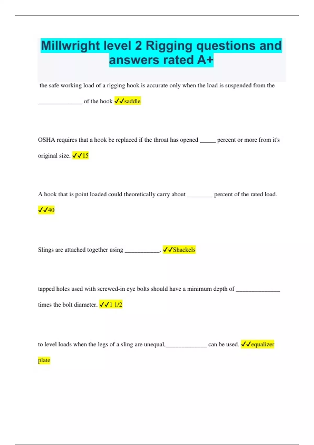 Millwright level 2 Rigging questions and answers rated A+