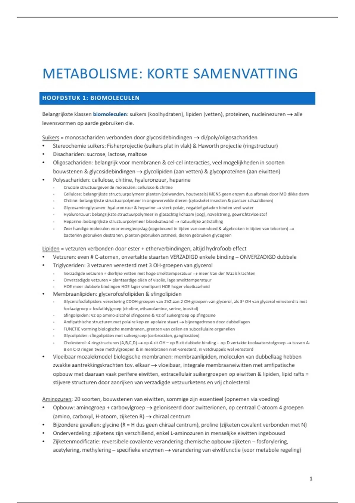 Korte samenvatting metabolisme - 2e bachelor tandheelkunde