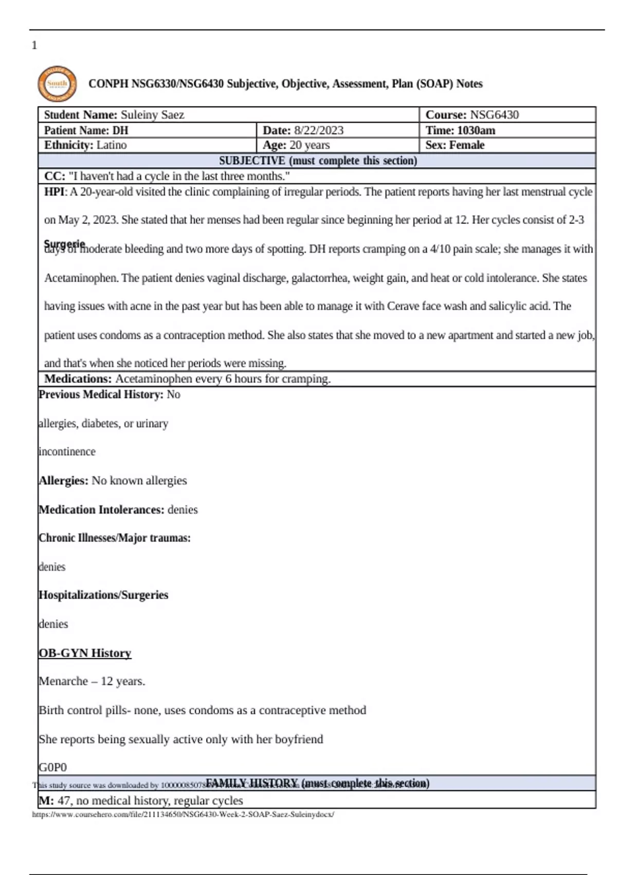 South University NSG 6430 Week 4 SOAP Fall 23.