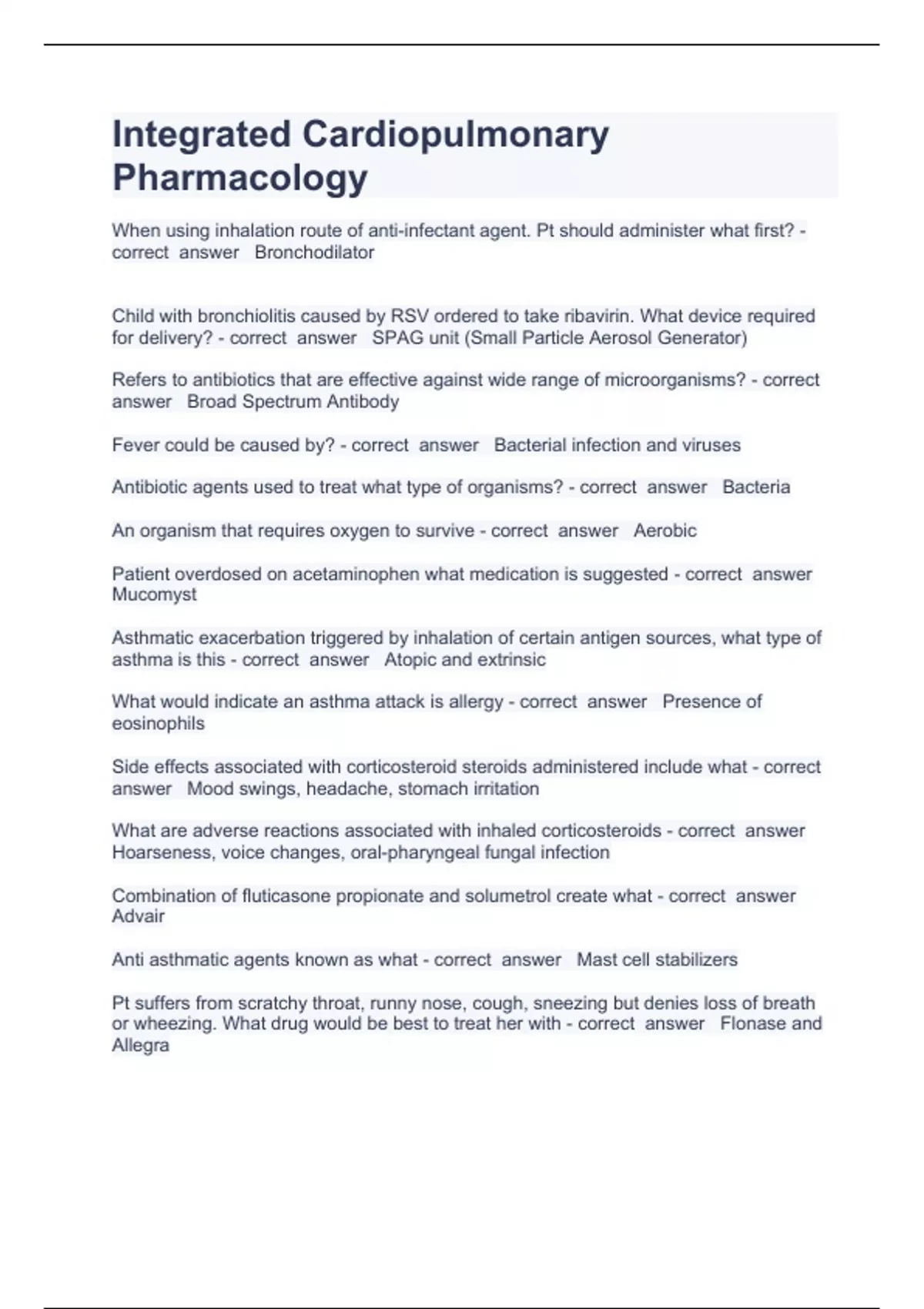PACKAGE DEAL OF INTERGRATED CARDIOPULMONARY PHARMACOLOGY QUESTIONS 2023 VERIFIED TO PASS