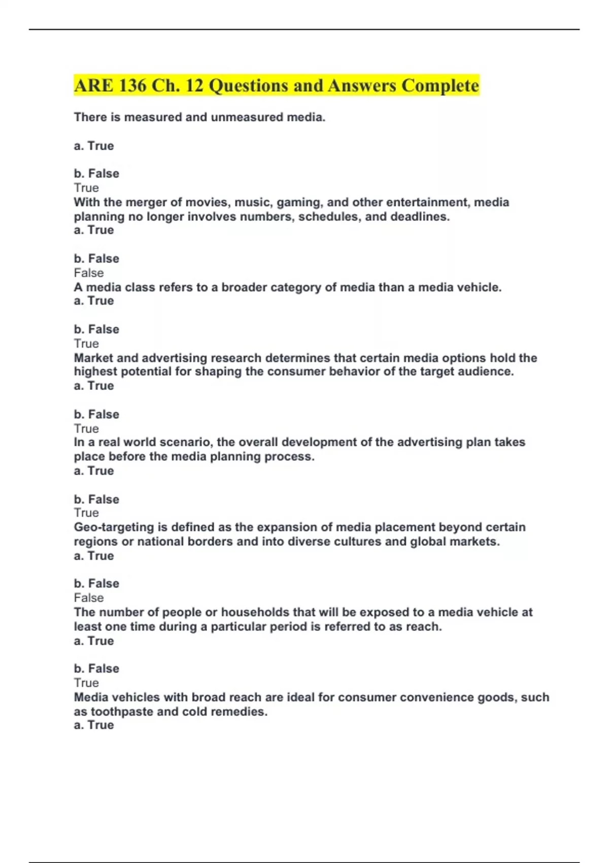 ARE 136 Ch. 12 Questions and Answers Complete There is measured and unmeasured media. a. True b. False True With the merger of movies, music, gaming, and other entertainment, media planning no longer involves numbers, schedules, and deadlines. a. True b. False False A media class refers to a broader category of media than a media vehicle. a. True b. False True Market and advertising research determines that certain media options hold the highest potential for shaping the consumer behavior of the target audience. a. True b. False True In a real world scenario, the overall development of the advertising plan takes place before the media planning process. a. True b. False True Geo-targeting is defined as the expansion of media placement beyond certain regions or national borders and into diverse cultures and global markets. a. True b. False False The number of people or households that will be exposed to a media vehicle at least one time during a particular period is referred to as reach. a. True b. False True Media vehicles with broad reach are ideal for consumer convenience goods, such as toothpaste and cold remedies. a. True