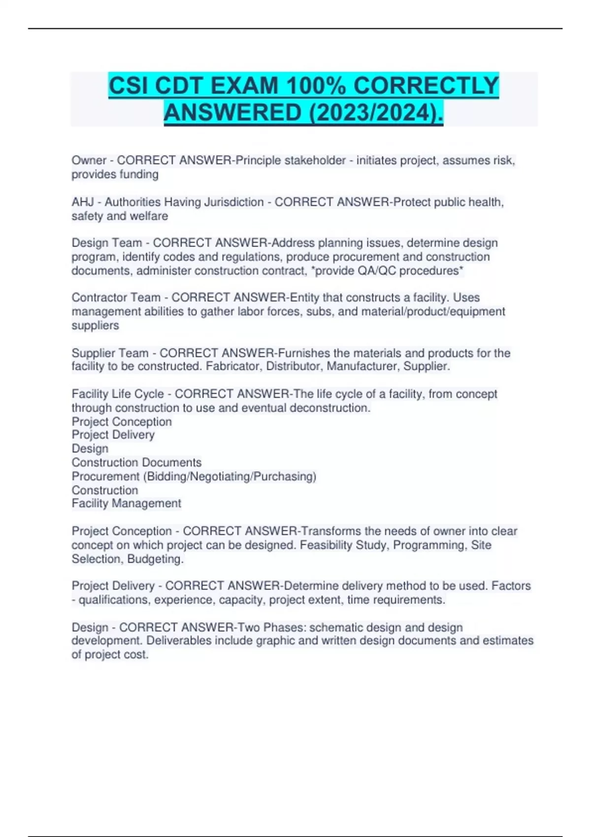 CSI CDT EXAM 100% CORRECTLY ANSWERED (2023/2024). Owner - CORRECT ANSWER-Principle stakeholder - initiates project, assumes risk, provides funding AHJ - Authorities Having Jurisdiction - CORRECT ANSWER-Protect public health, safety and welfare Design Team - CORRECT ANSWER-Address planning issues, determine design program, identify codes and regulations, produce procurement and construction documents, administer construction contract, *provide QA/QC procedures* Contractor Team - CORRECT ANSWER-Entity that constructs a facility. Uses management abilities to gather labor forces, subs, and material/product/equipment suppliers Supplier Team - CORRECT ANSWER-Furnishes the materials and products for the facility to be constructed. Fabricator, Distributor, Manufacturer, Supplier. Facility Life Cycle - CORRECT ANSWER-The life cycle of a facility, from concept through construction to use and eventual deconstruction. Project Conception Project Delivery Design Construction Documents Procurement (Bidding/Negotiating/Purchasing) Construction Facility Management Project Conception - CORRECT ANSWER-Transforms the needs of owner into clear concept on which project can be designed. Feasibility Study, Programming, Site Selection, Budgeting. Project Delivery - CORRECT ANSWER-Determine delivery method to be used. Factors - qualifications, experience, capacity, project extent, time requirements. Design - CORRECT ANSWER-Two Phases: schematic design and design development. Deliverables include graphic and written design documents and estimates of project cost. Schematic Design - CORRECT ANSWER-Overall relationships and functions. Site plan and area, general size/shape/massing of elements, elevations and exteriors established, conceptual design criteria identified. Deliverables - schematic drawings, probable cost, preliminary schedules Design Development - CORRECT ANSWER-Technical issues of constructibility and integration of systems and components. Deliverables - Tech information, outline specifications, updated schedule, updated cost estimate. Construction Documents - CORRECT ANSWER-Defined as the written and graphic documents prepared or assembled by the A/E for communicating the project design for construction and administering the construction contract. Construction documents include two major types of documents: Procurement documents and Contract documents. Procurement (Bidding/Negotiating/Purchasing) - CORRECT ANSWER-Acceptance of the contractor's bid or negotiated sum and other conditions will result in award of a contract and commencement of work. Construction - CORRECT ANSWER-Responsibilities: Contractor - perform work, project coordination, comply with project documents. A/E - construction admin, evaluation services, certify application for payment, final inspection of work. Owner - provide information, process payments, approve contract modifications, accept project upon completion. Facility Management - CORRECT ANSWER-During occupancy, owners & facility managers maintain and evaluate the performance of the project and determine suitability for continuing use. OmniClass - CORRECT ANSWER-A multi-table informational framework for organizing information used by the architectural, engineering, and construction industry. UniFormat - CORRECT ANSWER-Uniform classification system for organizing preliminary construction information into a standard order or sequence on the basis of systems or assemblies. Particularly useful in conceptual design. Element Identification. MasterFormat - CORRECT ANSWER-Arranges related construction practices, logical groupings of work results, into a series of divisions. 50 division format. Used for Specifications, data organization, and cost classification. MasterFormat Groups - CORRECT ANSWER-00 Procurement and