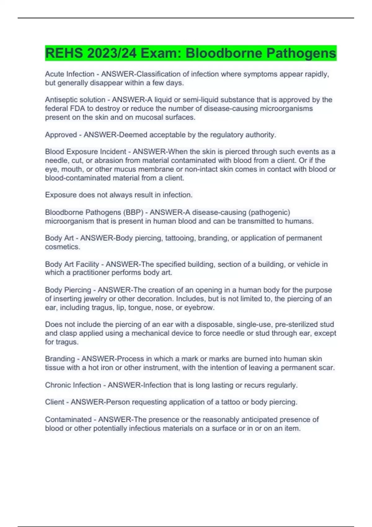 Acute Infection - ANSWER-Classification of infection where symptoms appear rapidly, but generally disappear within a few days. Antiseptic solution - ANSWER-A liquid or semi-liquid substance that is approved by the federal FDA to destroy or reduce the number of disease-causing microorganisms present on the skin and on mucosal surfaces. Approved - ANSWER-Deemed acceptable by the regulatory authority. Blood Exposure Incident - ANSWER-When the skin is pierced through such events as a needle, cut, or abrasion from material contaminated with blood from a client. Or if the eye, mouth, or other mucus membrane or non-intact skin comes in contact with blood or blood-contaminated material from a client. Exposure does not always result in infection. Bloodborne Pathogens (BBP) - ANSWER-A disease-causing (pathogenic) microorganism that is present in human blood and can be transmitted to humans. Body Art - ANSWER-Body piercing, tattooing, branding, or application of permanent cosmetics. Body Art Facility - ANSWER-The specified building, section of a building, or vehicle in which a practitioner performs body art. Body Piercing - ANSWER-The creation of an opening in a human body for the purpose of inserting jewelry or other decoration. Includes, but is not limited to, the piercing of an ear, including tragus, lip, tongue, nose, or eyebrow. Does not include the piercing of an ear with a disposable, single-use, pre-sterilized stud and clasp applied using a mechanical device to force needle or stud through ear, except for tragus. Branding - ANSWER-Process in which a mark or marks are burned into human skin tissue with a hot iron or other instrument, with the intention of leaving a permanent scar. Chronic Infection - ANSWER-Infection that is long lasting or recurs regularly. Client - ANSWER-Person requesting application of a tattoo or body piercing. Contaminated - ANSWER-The presence or the reasonably anticipated presence of blood or other potentially infectious materials on a surface or in or on an item.
