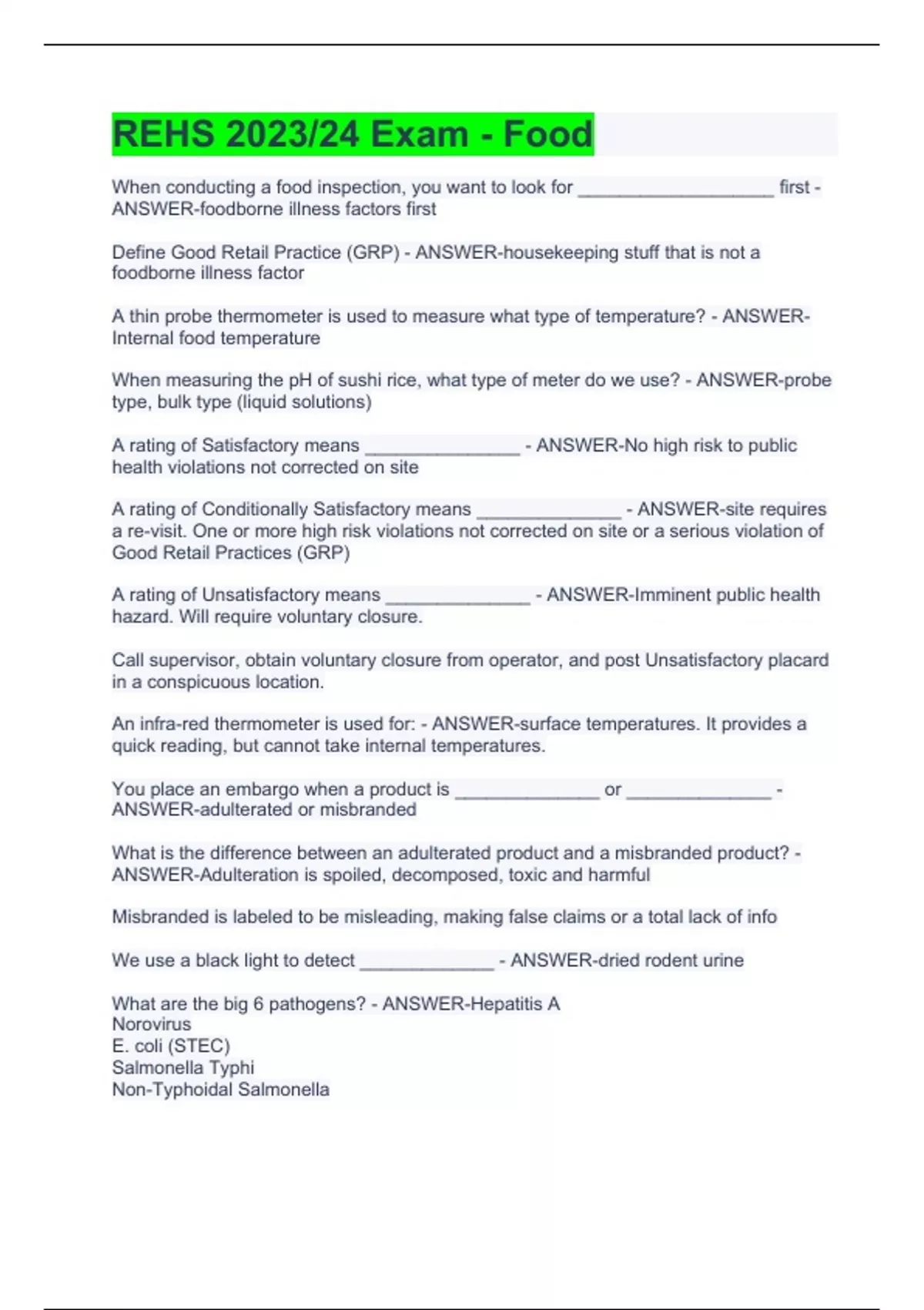 When conducting a food inspection, you want to look for ___________________ first - ANSWER-foodborne illness factors first Define Good Retail Practice (GRP) - ANSWER-housekeeping stuff that is not a foodborne illness factor A thin probe thermometer is used to measure what type of temperature? - ANSWER-Internal food temperature When measuring the pH of sushi rice, what type of meter do we use? - ANSWER-probe type, bulk type (liquid solutions) A rating of Satisfactory means _______________ - ANSWER-No high risk to public health violations not corrected on site A rating of Conditionally Satisfactory means ______________ - ANSWER-site requires a re-visit. One or more high risk violations not corrected on site or a serious violation of Good Retail Practices (GRP) A rating of Unsatisfactory means ______________ - ANSWER-Imminent public health hazard. Will require voluntary closure. Call supervisor, obtain voluntary closure from operator, and post Unsatisfactory placard in a conspicuous location. An infra-red thermometer is used for: - ANSWER-surface temperatures. It provides a quick reading, but cannot take internal temperatures. You place an embargo when a product is ______________ or ______________ - ANSWER-adulterated or misbranded What is the difference between an adulterated product and a misbranded product? - ANSWER-Adulteration is spoiled, decomposed, toxic and harmful Misbranded is labeled to be misleading, making false claims or a total lack of info We use a black light to detect _____________ - ANSWER-dried rodent urine What are the big 6 pathogens? - ANSWER-Hepatitis A Norovirus E. coli (STEC) Salmonella Typhi Non-Typhoidal Salmonella