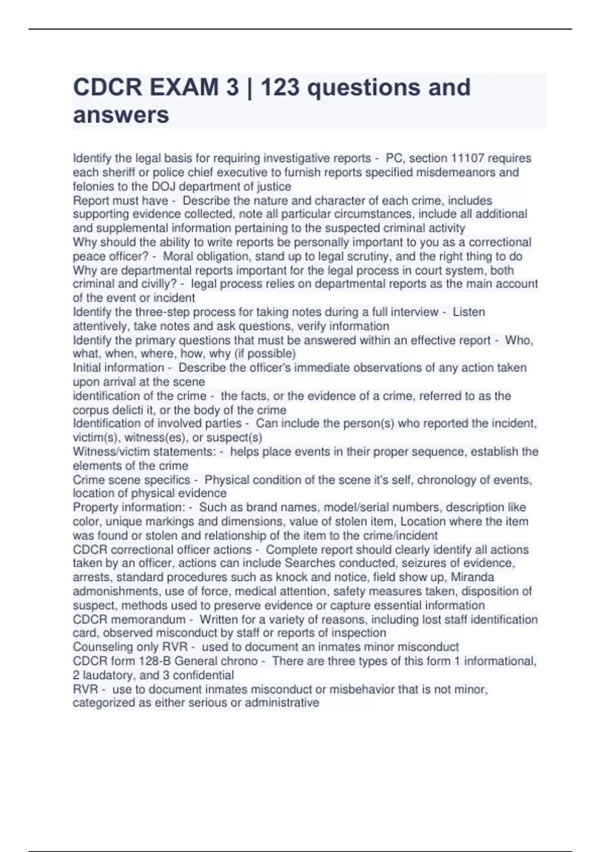 CDCR EXAM 3 | 123 questions and answers Identify the legal basis for requiring investigative reports - PC, section 11107 requires each sheriff or police chief executive to furnish reports specified misdemeanors and felonies to the DOJ department of justice Report must have - Describe the nature and character of each crime, includes supporting evidence collected, note all particular circumstances, include all additional and supplemental information pertaining to the suspected criminal activity Why should the ability to write reports be personally important to you as a correctional peace officer? - Moral obligation, stand up to legal scrutiny, and the right thing to do Why are departmental reports important for the legal process in court system, both criminal and civilly? - legal process relies on departmental reports as the main account of the event or incident Identify the three-step process for taking notes during a full interview - Listen attentively, take notes and ask questions, verify information Identify the primary questions that must be answered within an effective report - Who, what, when, where, how, why (if possible) Initial information - Describe the officer's immediate observations of any action taken upon arrival at the scene identification of the crime - the facts, or the evidence of a crime, referred to as the corpus delicti it, or the body of the crime Identification of involved parties - Can include the person(s) who reported the incident, victim(s), witness(es), or suspect(s) Witness/victim statements: - helps place events in their proper sequence, establish the elements of the crime Crime scene specifics - Physical condition of the scene it's self, chronology of events, location of physical evidence Property information: - Such as brand names, model/serial numbers, description like color, unique markings and dimensions, value of stolen item, Location where the item was found or stolen and relationship of the item to the crime/incident CDCR correctional officer actions - Complete report should clearly identify all actions taken by an officer, actions can include Searches conducted, seizures of evidence, arrests, standard procedures such as knock and notice, field show up, Miranda admonishments, use of force, medical attention, safety measures taken, disposition of suspect, methods used to preserve evidence or capture essential information CDCR memorandum - Written for a variety of reasons, including lost staff identification card, observed miscon