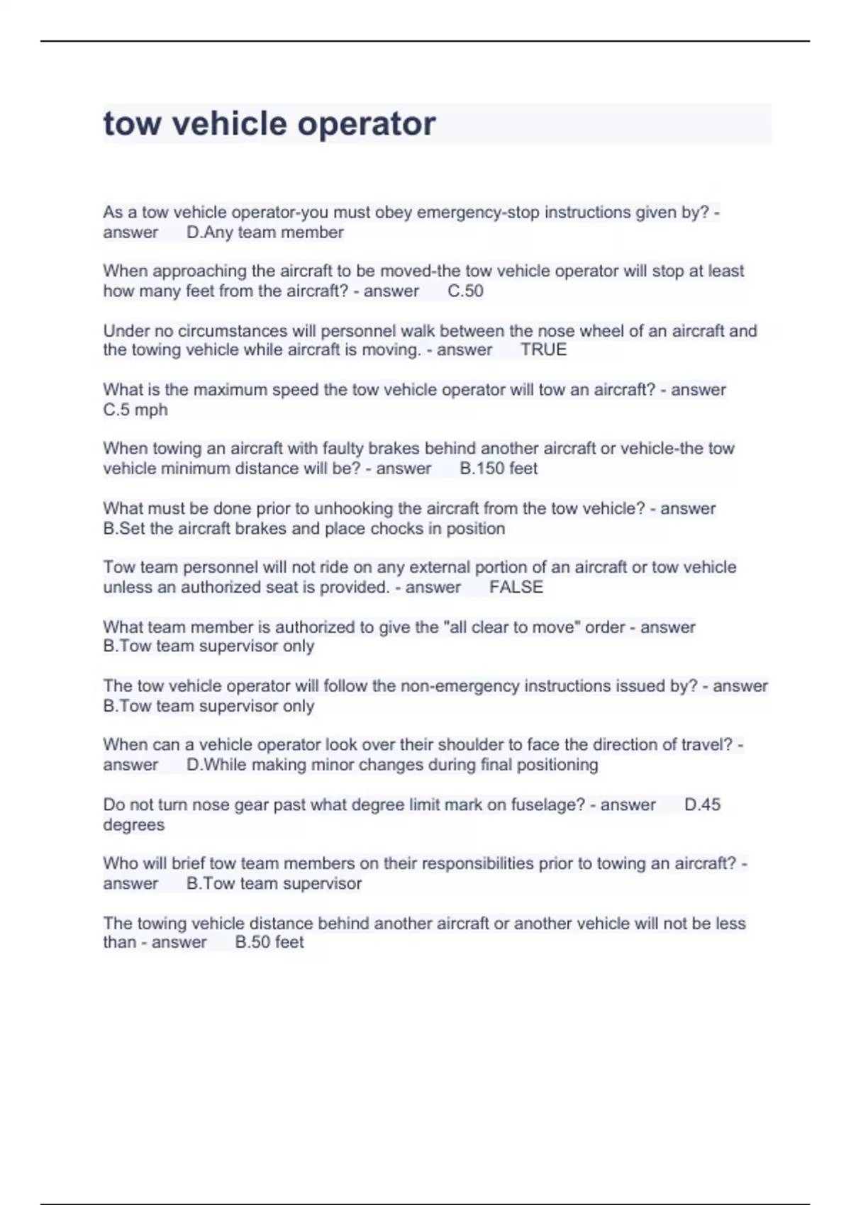 tow vehicle operator Questions and Answers 100% correct