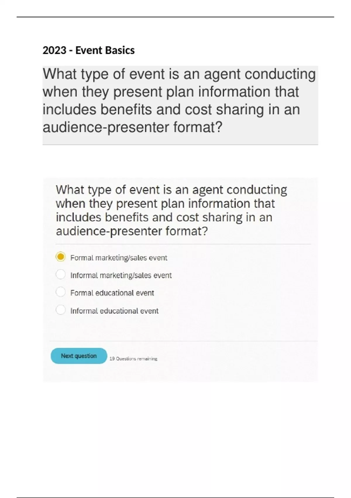 UHC Events BasicsWhat type of event is an agent conducting when they present plan information that includes benefits and cost sharing in an audience-presenter format? Louise wants to hold an event that helps consumers understand Medicare programs and perhaps improve their health/wellness knowledge, but she is not interested in completing enrollment applications at the event. She would like to staff a table at the public library and have consumers approach her. What type of event does Louise need to conduct