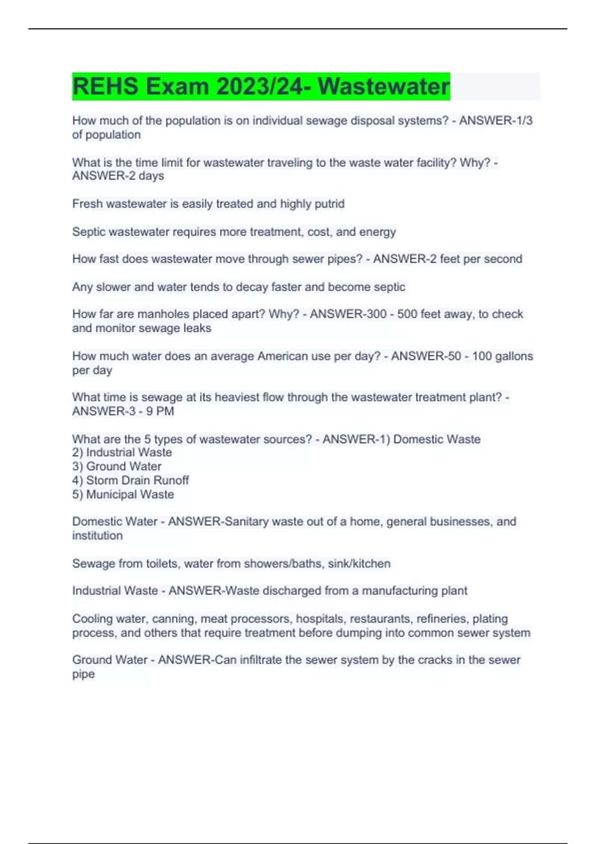 How much of the population is on individual sewage disposal systems? - ANSWER-1/3 of population What is the time limit for wastewater traveling to the waste water facility? Why? - ANSWER-2 days Fresh wastewater is easily treated and highly putrid Septic wastewater requires more treatment, cost, and energy How fast does wastewater move through sewer pipes? - ANSWER-2 feet per second Any slower and water tends to decay faster and become septic How far are manholes placed apart? Why? - ANSWER-300 - 500 feet away, to check and monitor sewage leaks How much water does an average American use per day? - ANSWER-50 - 100 gallons per day What time is sewage at its heaviest flow through the wastewater treatment plant? - ANSWER-3 - 9 PM What are the 5 types of wastewater sources? - ANSWER-1) Domestic Waste 2) Industrial Waste 3) Ground Water 4) Storm Drain Runoff 5) Municipal Waste Domestic Water - ANSWER-Sanitary waste out of a home, general businesses, and institution Sewage from toilets, water from showers/baths, sink/kitchen Industrial Waste - ANSWER-Waste discharged from a manufacturing plant Cooling water, canning, meat processors, hospitals, restaurants, refineries, plating process, and others that require treatment before dumping into common sewer system Ground Water - ANSWER-Can infiltrate the sewer system by the cracks in the sewer pipe