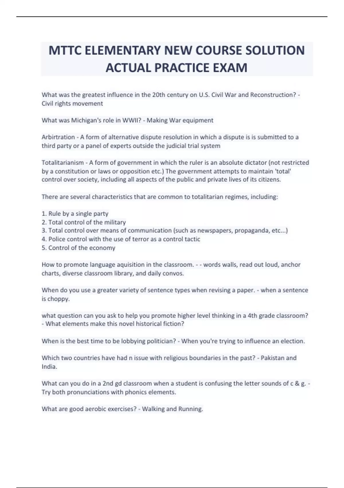 MTTC ELEMENTARY NEW COURSE SOLUTION ACTUAL PRACTICE EXAM