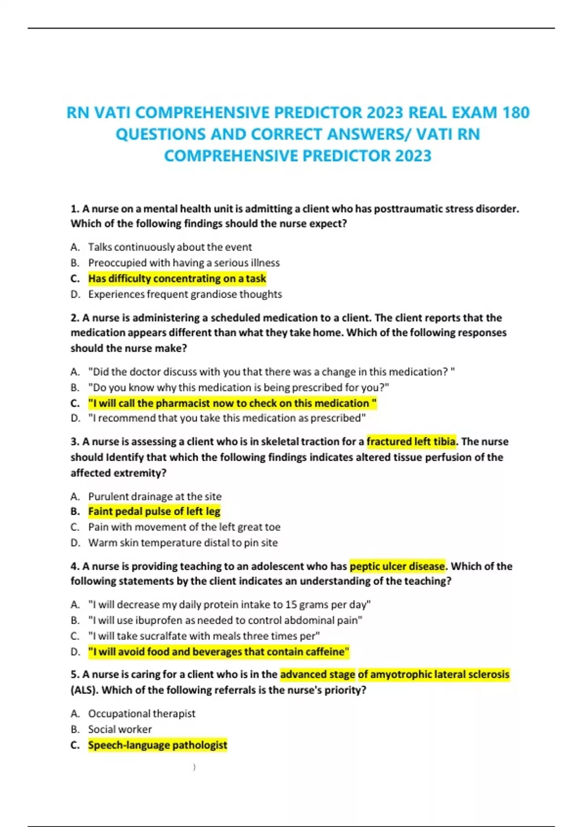 RN VATI COMPREHENSIVE PREDICTOR 2023 REAL EXAM 180 QUESTIONS AND CORRECT ANSWERS