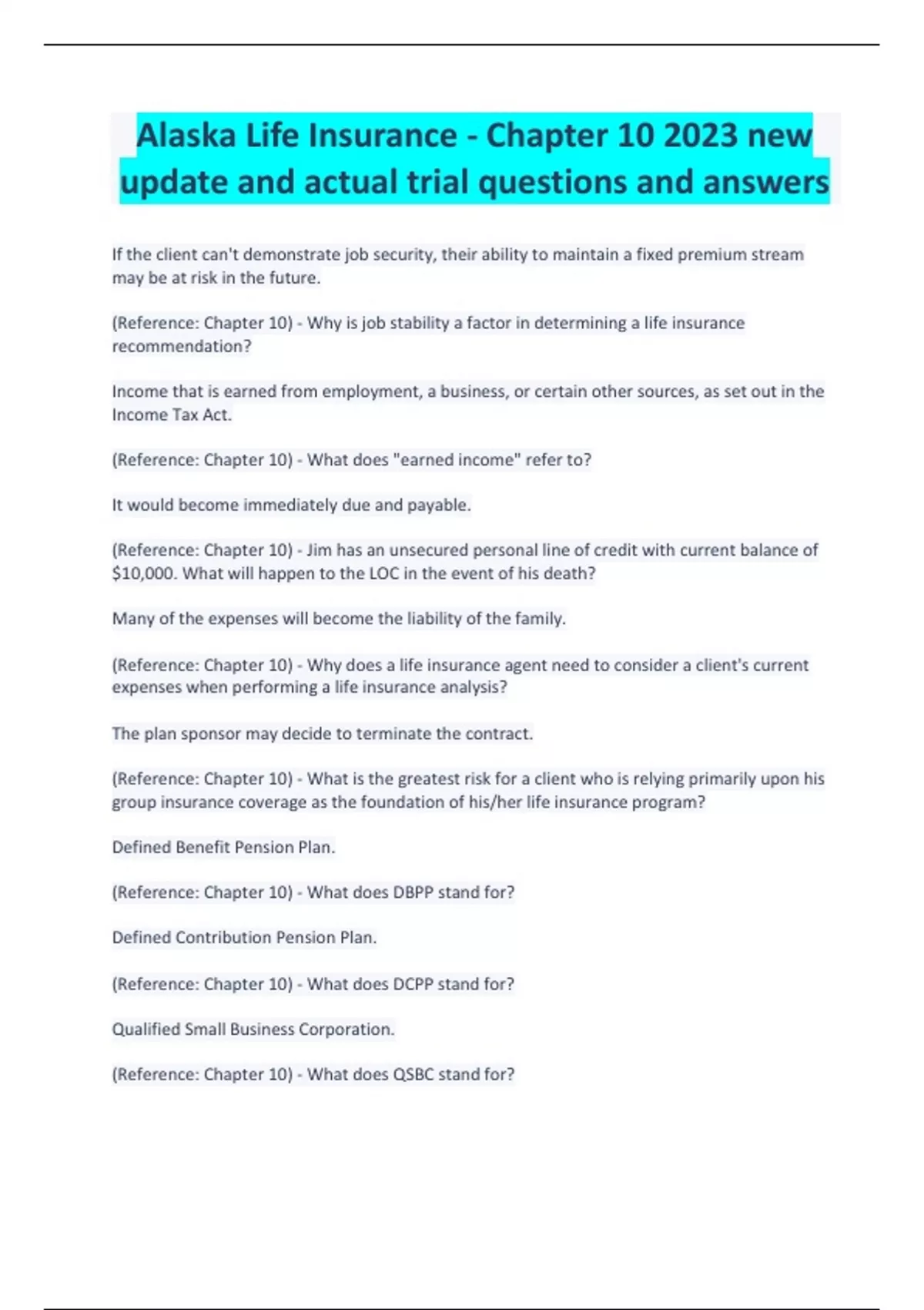 Alaska Life Insurance - Chapter 10 2023 new update and actual trial questions and answers