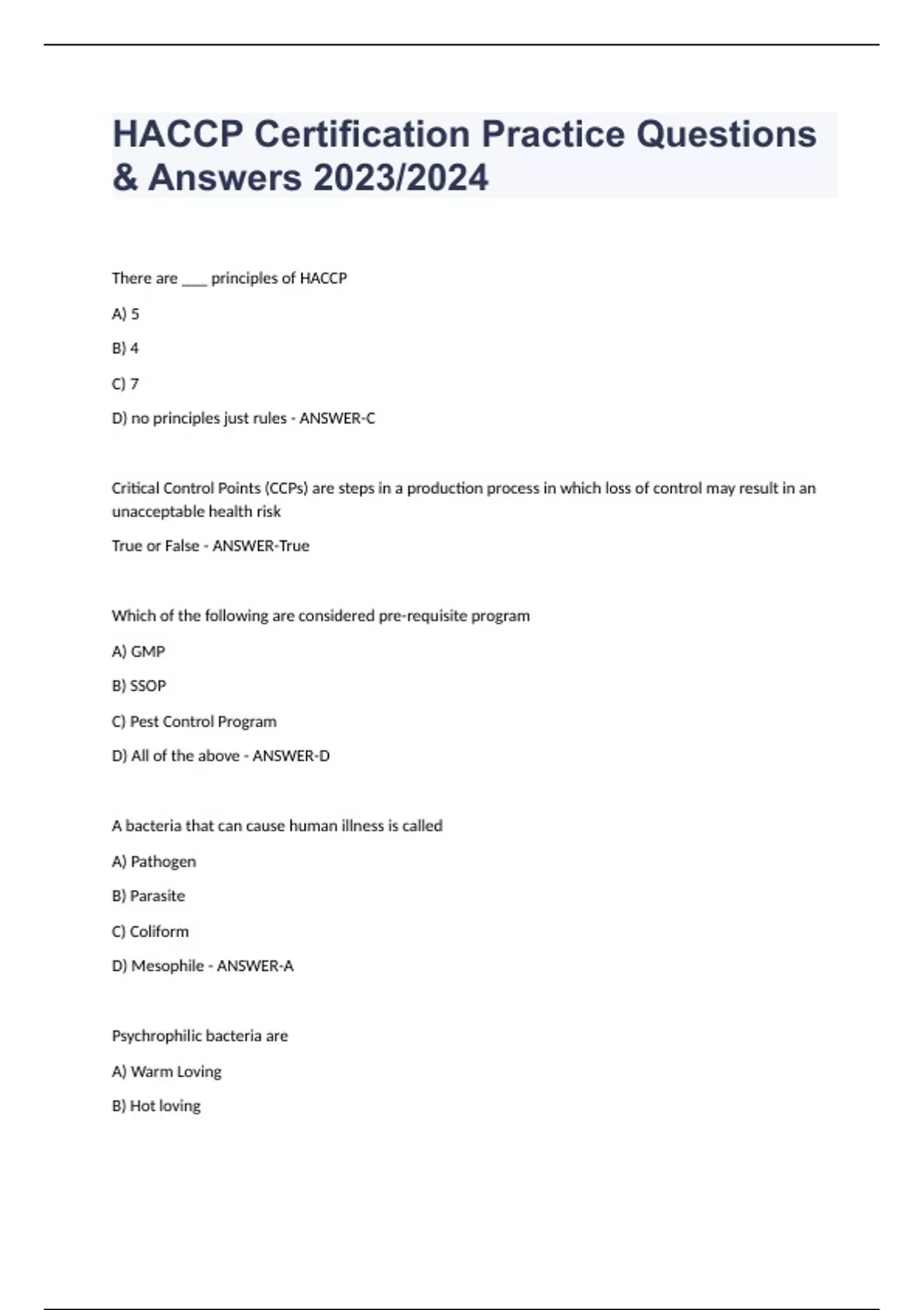 HACCP Certification Practice Questions & Answers 2023/2024 There are ___ principles of HACCP A) 5 B) 4 C) 7 D) no principles just rules - ANSWER-C Critical Control Points (CCPs) are steps in a production process in which loss of control may result in an unacceptable health risk True or False - ANSWER-True Which of the following are considered pre-requisite program A) GMP B) SSOP C) Pest Control Program D) All of the above - ANSWER-D A bacteria that can cause human illness is called A) Pathogen B) Parasite C) Coliform D) Mesophile - ANSWER-A Psychrophilic bacteria are A) Warm Loving B) Hot loving