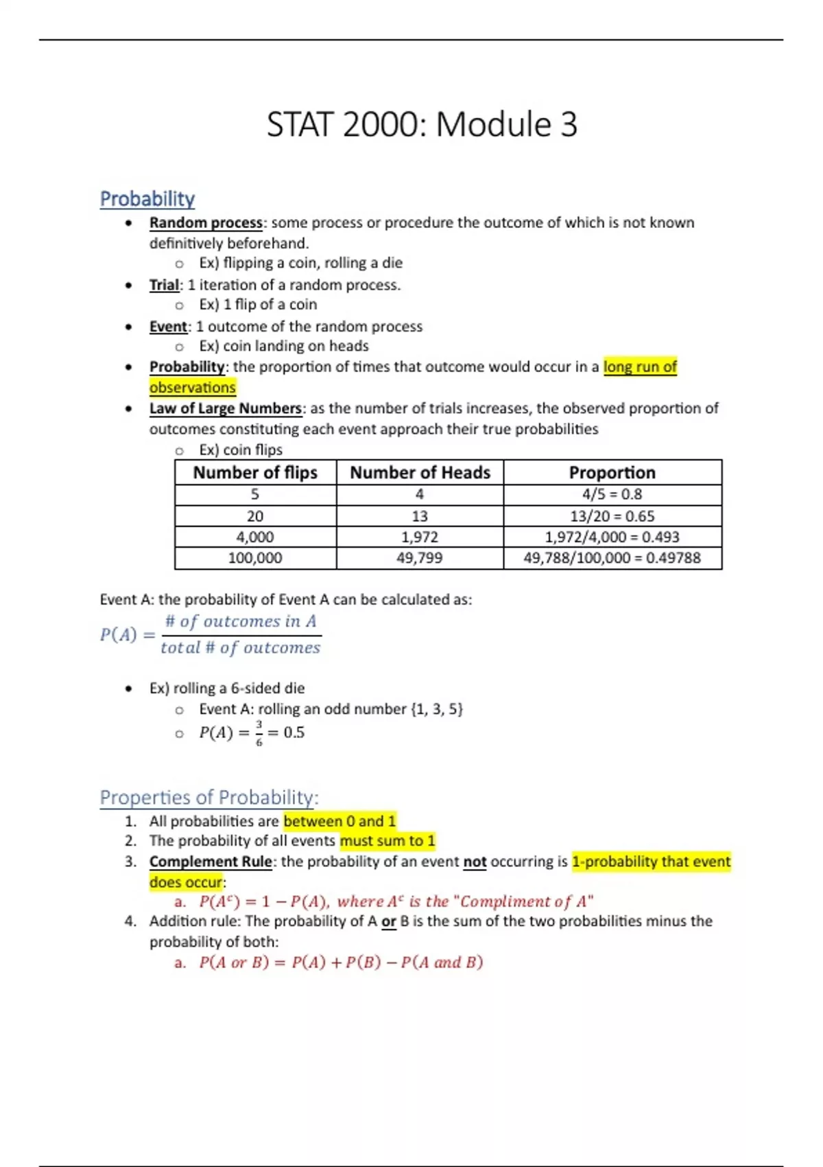 Rather than deterministic processes, statistics works primarily with probabilistic processes - processes in which the outcome is not predetermined. In this module, you will learn the basics of using probability to make reliable predictions about unreliable events. Learning Objectives: 1. Find basic probabilities from tables or descriptions. 2. Use the rules of probability- complement, addition, and multiplication- in the appropriate context. 3. Find conditional probabilities. 4. Verify the validity of probability distributions using the two properties of valid probability distributions. 5. Calculate and interpret expected values for discrete probability distributions. 6. Use normal probability distributions to calculate probabilities for continuous, quantitative contexts. NOTICE!!! I ACCIDENTALLY POSTED INCOMPLETE NOTES I WILL UPDATE THIS MODULE WITH THE COMPLETE NOTES ASAP. SORRY FOR ANY INCONVENIENCE!!