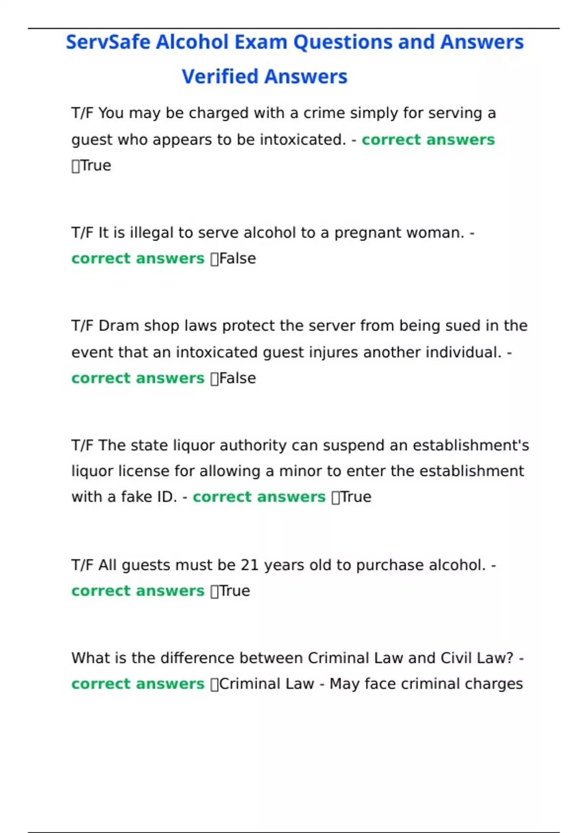 ServSafe Alcohol Exam Questions and Answers Updated (2023 / 2024) (Verified Answers)