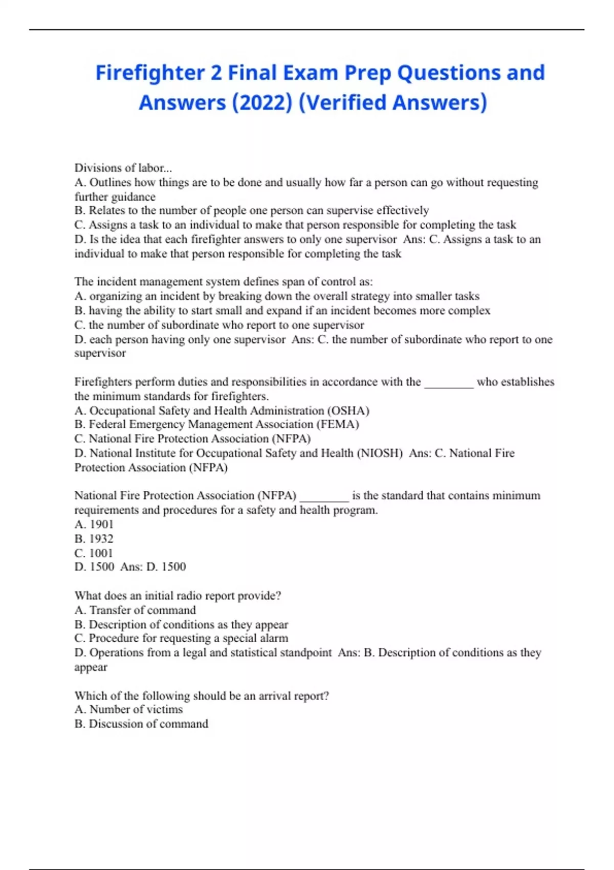 Firefighter 2 Final Exam Prep Questions and Answers (2022) (Verified Answers) Divisions of labor... A. Outlines how things are to be done and usually how far a person can go without requesting further guidance B. Relates to the number of people one person can supervise effectively C. Assigns a task to an individual to make that person responsible for completing the task D. Is the idea that each firefighter answers to only one supervisor C. Assigns a task to an individual to make that person responsible for completing the task The incident management system defines span of control as: A. organizing an incident by breaking down the overall strategy into smaller tasks B. having the ability to start small and expand if an incident becomes more complex C. the number of subordinate who report to one supervisor D. each person having only one supervisor C. the number of subordinate who report to one supervisor Firefighters perform duties and responsibilities in accordance with the ________ who establishes the minimum standards for firefighters. A. Occupational Safety and Health Administration (OSHA) B. Federal Emergency Management Association (FEMA) C. National Fire Protection Association (NFPA) D. National Institute for Occupational Safety and Health (NIOSH) C. National Fire Protection Association (NFPA) National Fire Protection Association (NFPA) ________ is the standard that contains minimum requirements and procedures for a safety and health program. A. 1901 B. 1932 C. 1001 D. 1500 D. 1500 What does an initial radio report provide? A. Transfer of command B. Description of conditions as they appear C. Procedure for requesting a special alarm D. Operations from a legal and statistical standpoint B. Description of conditions as