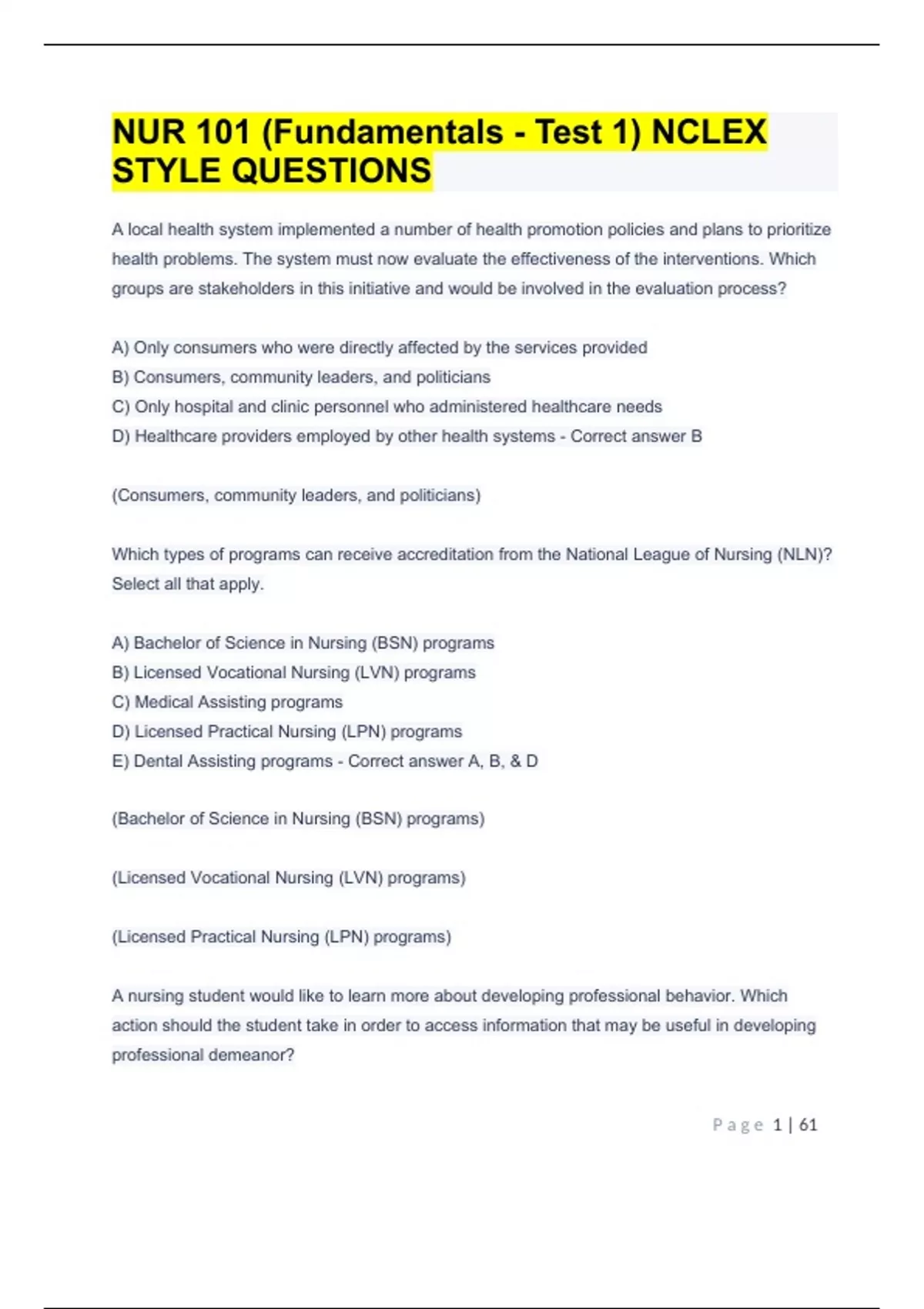 NUR 101 (Fundamentals - Test 1) NCLEX STYLE QUESTIONSNUR 101 (Fundamentals - Test 1) NCLEX STYLE QUESTIONS