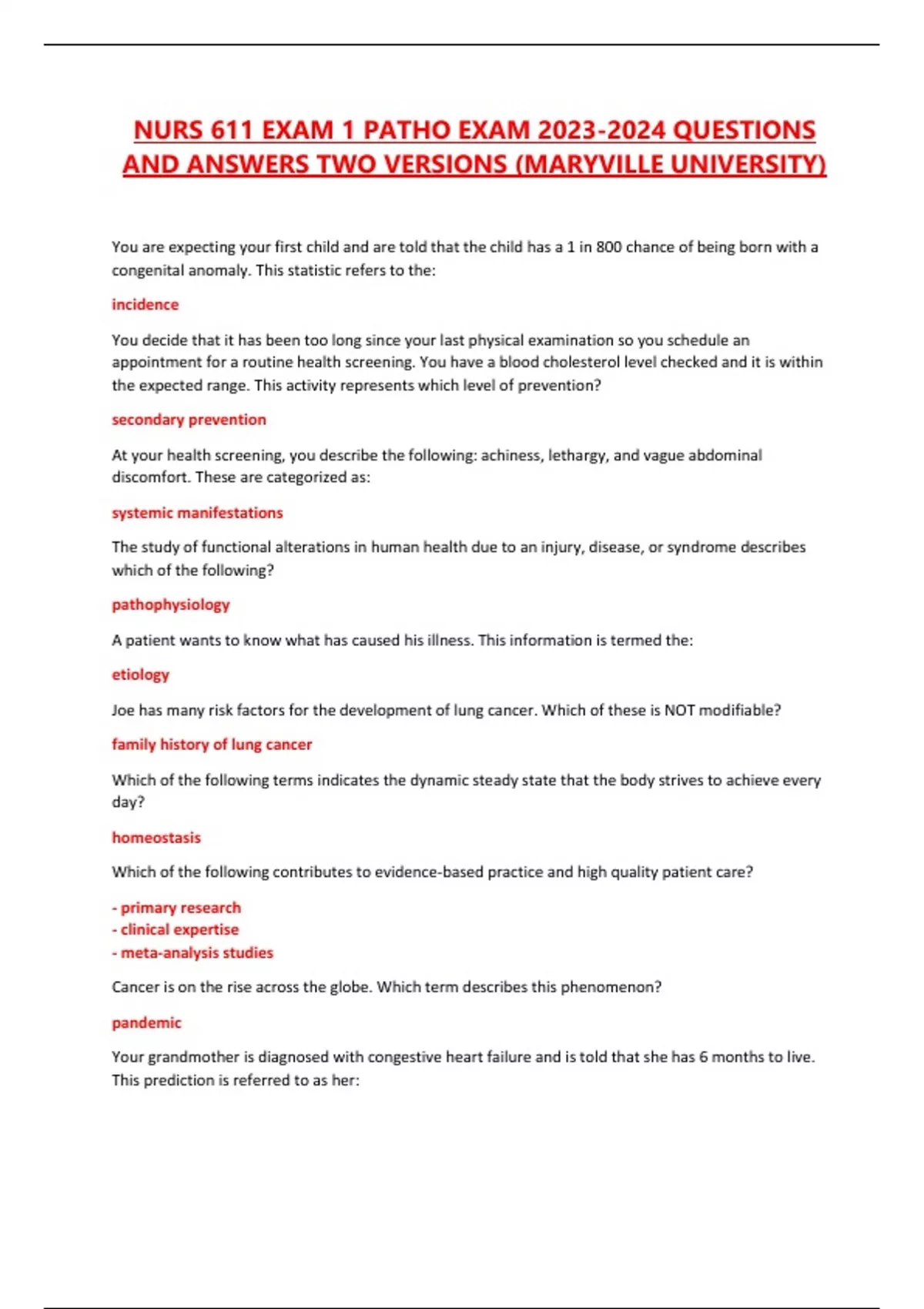 NURS 611 EXAM 1 PATHO EXAM QUESTIONS AND ANSWERS TWO VERSIONS (MARYVILLE UNIVERSITY)