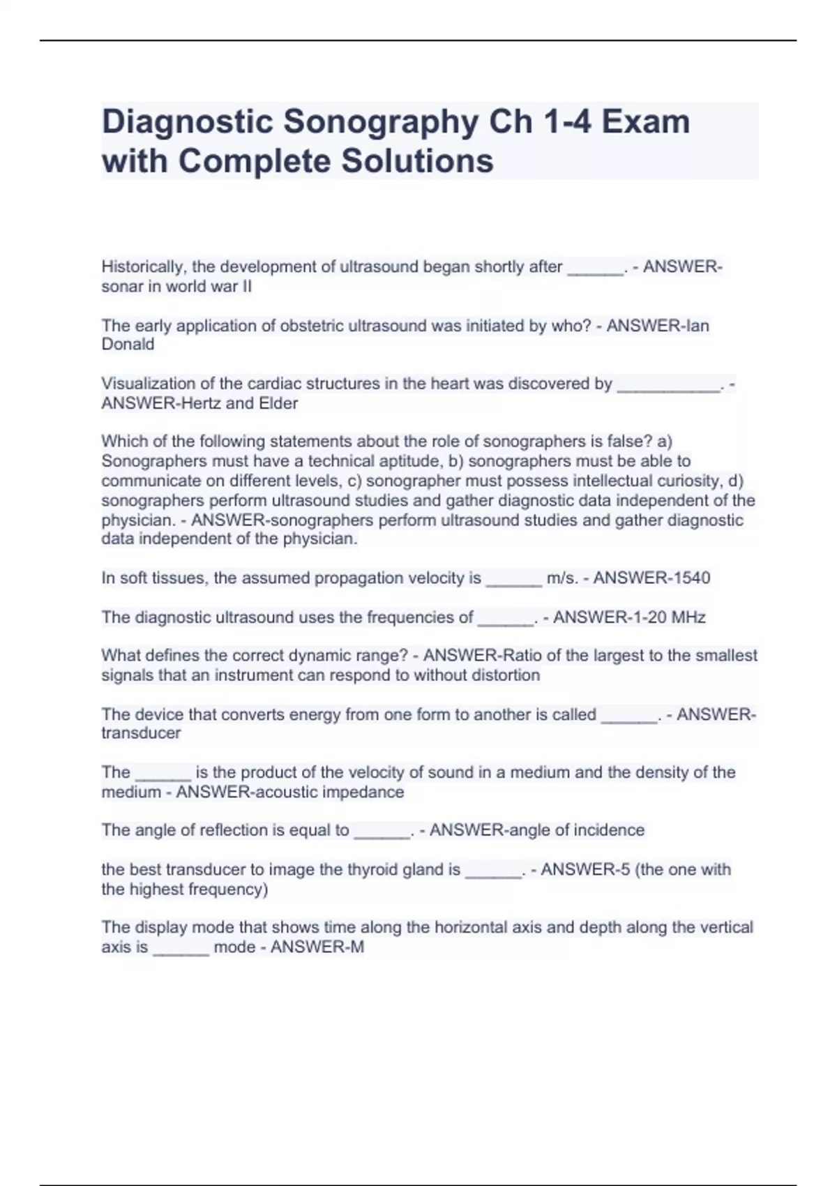 Diagnostic Sonography Ch 1-4 Exam with Complete Solutions Diagnostic Sonography Ch 1-4 Exam with Complete Solutions Diagnostic Sonography Ch 1-4 Exam with Complete Solutions Diagnostic Sonography Ch 1-4 Exam with Complete Solutions Historically, the development of ultrasound began shortly after ______. - ANSWER-sonar in world war II The early application of obstetric ultrasound was initiated by who? - ANSWER-Ian Donald Visualization of the cardiac structures in the heart was discovered by ___________. - ANSWER-Hertz and Elder Which of the following statements about the role of sonographers is false? a) Sonographers must have a technical aptitude, b) sonographers must be able to communicate on different levels, c) sonographer must possess intellectual curiosity, d) sonographers perform ultrasound studies and gather diagnostic data independent of the physician. - ANSWER-sonographers perform ultrasound studies and gather diagnostic data independent of the physician. In soft tissues, the assumed propagation velocity is ______ m/s. - ANSWER-1540 The diagnostic ultrasound uses the frequencies of ______. - ANSWER-1-20 MHz What defines the correct dynamic range? - ANSWER-Ratio of the largest to the smallest signals that an instrument can respond to without distortion The device that converts energy from one form to another is called ______. - ANSWER-transducer The ______ is the product of the velocity of sound in a medium and the density of the