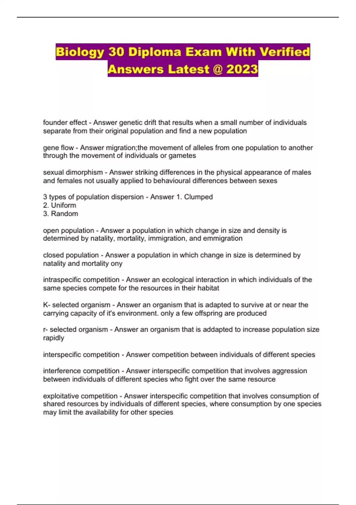 Biology 30 Diploma Exam With Verified Answers Latest @ 2023