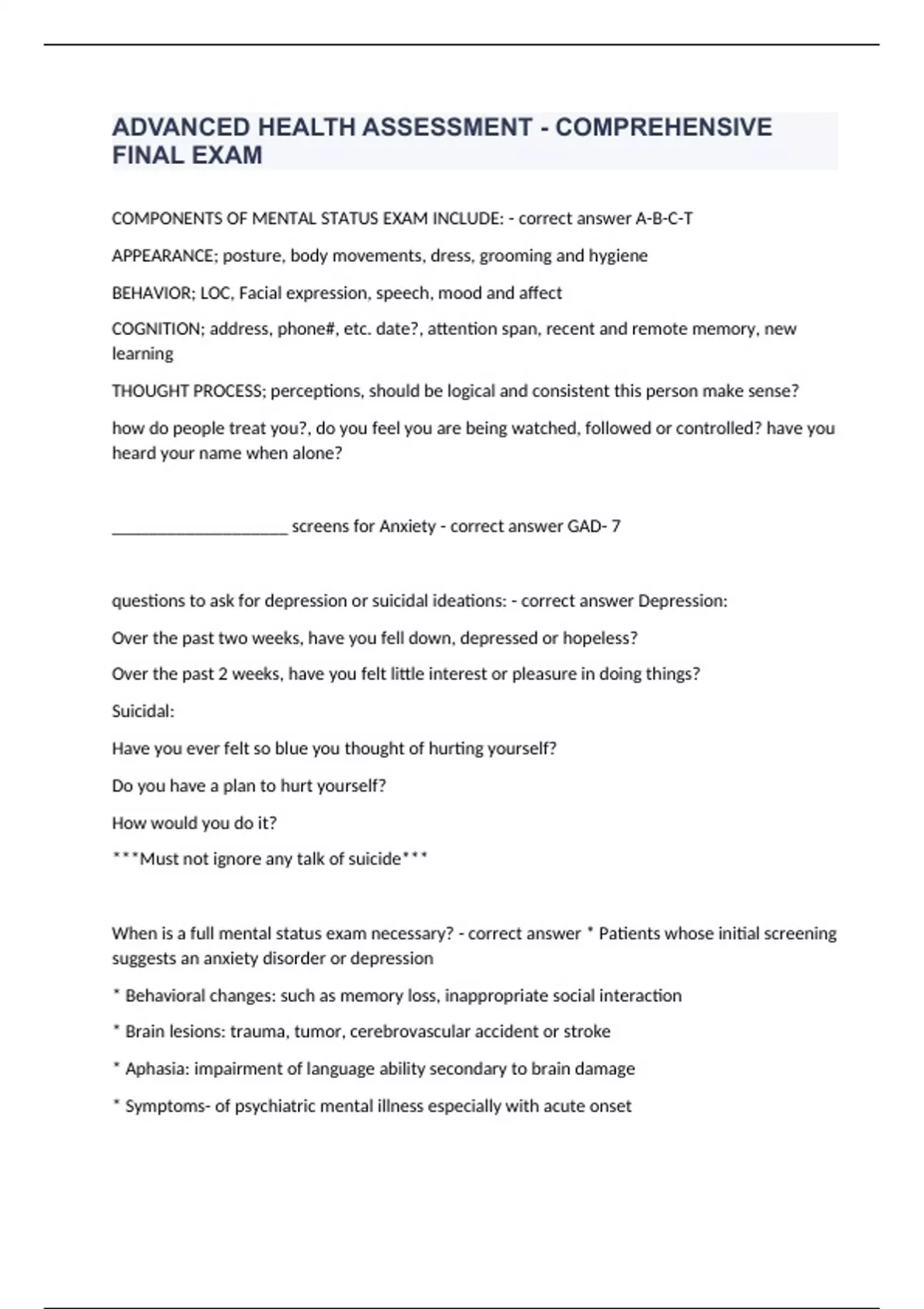 ADVANCED HEALTH ASSESSMENT - COMPREHENSIVE FINAL EXAM