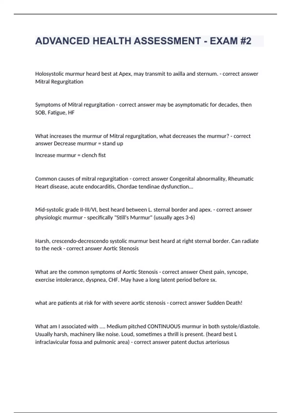 Holosystolic murmur heard best at Apex, may transmit to axilla and sternum. - correct answer Mitral Regurgitation Symptoms of Mitral regurgitation - correct answer may be asymptomatic for decades, then SOB, Fatigue, HF What increases the murmur of Mitral regurgitation, what decreases the murmur? - correct answer Decrease murmur = stand up Increase murmur = clench fist Common causes of mitral regurgitation - correct answer Congenital abnormality, Rheumatic Heart disease, acute endocarditis, Chordae tendinae dysfunction... Mid-systolic grade II-III/VI, best heard between L. sternal border and apex. - correct answer physiologic murmur - specifically "Still's Murmur" (usually ages 3-6) Harsh, crescendo-decrescendo systolic murmur best heard at right sternal border. Can radiate to the neck - correct answer Aortic Stenosis What are the common symptoms of Aortic Stenosis - correct answer Chest pain, syncope, exercise intolerance, dyspnea, CHF. May have a long latent period before sx. what are patients at risk for with severe aortic stenosis - correct answer Sudden Death! What am I associated with .... Medium pitched CONTINUOUS murmur in both systole/diastole. Usually harsh, machinery like noise. Loud, sometimes a thrill is present. (heard best L infraclavicular fossa and pulmonic area) - correct answer patent ductus arteriosus Mid-to late systolic murmur, may have a mid-systolic click best heard over the lower left sternal border. - correct answer Mitral Valve Prolapse what are the symptoms associated with MVP? - correct answer Most people are asymptomatic. May have chest pain, palpitation, mild dyspnea, fatigue, anxiety. Loud, blowing, high pitched diastolic murmur best heard Lower Left Sternal Border.. - correct answer Aortic insufficiency / Aortic regurgitation What are symptoms associated with severe aortic regurgitation? - correct answer Dyspnea, fatigue, CHF, widened pulse pressure. Water-hammer pulse Low pitched, mid-diastolic rumble best heard at the apex in the Left Lateral position. May also hear an "opening Snap" - correct answer Mitral Stenosis What is the most common cause for mitral stenosis - correct answer Rheumatic Heart Disease What are the sx associated with Mitral stenosis? - correct answer DYSPNEA, fatigue, palpitations, hemoptysis, angina-like chest pain. A-fib is common What are patients with Mitral Stenosis at risk for? (2 things) - correct answer Thromboembolization & pulmonary hypertension Which murmurs are louder during inspiration? (left or right) - correct answer Right Which murmurs are louder during expiration? (left or right) - correct answer Left Early, mid, or late systolic OR pansystolic Medium pitched murmur best heard at the lower left sternal border. Can radiate to the right sternal border? - correct answer Tricuspid Regurgitation/Insufficiency What is associated with a Pansystolic, louder in midsystole. best heard at LSB with radiation to the RSB. May have systolic THRILL at LLSB. Increased murmur with Valsalva. - correct answer Ventricular Septal Defect In a fetus, blood flows from the right atrium to the left atrium through the __________. - correct answer Foramen ovale In a fetus, the connection between the pulmonary artery and aorta is the ___________. - correct answer Ductus arteriosus _________ brings blood back from the fetus to the placenta - correct answer umbilical artery ________ brings blood from the placenta to the fetus - correct answer umbilical vein Which 3 CHD are associated with INCREASED pulmonary blood flow - correct answer PDA, ASD, VSD What are symptoms associated with Patent Ductus arteriosus? - correct answer may be asymptomatic, or CHF, bounding peripheral pulses, WIDE pulse pressure, II-V Harsh machinery like CONTINUOUS murmur best heard left clavicle, 1st/2nd L ICS. What is the treatment for PDA? - correct answer Indomethacin to effect closure Blood flows from Left to Right Atrium through an opening. Can result in R atrium and ventricle distention, and increased pulmonary blood flow. - correct answer Atrial Septal Defect Symptoms of ASD? - correct answer fatigue, exertional dyspnea, RARELY CHF.. may see pulmonary symptoms later in life if unrepaired. Shunt between the Left and Right Ventricle - correct answer Ventricular Septal defect What are the 4 associated defects of Tetralogy of Fallot? - correct answer 1. Pulmonic stenosis 2. Large VSD 3. Overriding aorta 4. Right Ventricular hypertrophy 2 CHD with DECREASED Pulmonary blood flow (CYANOTIC) - correct answer Tetrology of fallot and tricuspid atresia Symptoms of Tetralogy of Fallot? - correct answer cyanosis with feeding, hypercyanotic spells, squatting improves pulmonary blood flow. Grade III-VI harsh systolic ejection murmur. chest xray of tetralogy of Fallot - correct answer boot shaped heart lack of connection between right atrium and right ventricle - correct answer Tricuspid atresia (TA) Symptoms of Tricuspid atresia? - correct answer cyanosis at birth or a fews days after, difficulty feeding, week suck, clubbing, tachycardia, tachypnea, crackles.. Treatment for Tricuspid atresia? - correct answer IV PGE1 (prostoglandin) to keep the PDA open. then surgery. Position for Tet spell to help relieve cyanotic episode - correct answer cradled in knee position Obstructive blood flow disorders (three) - correct answer 1. coarctation of the aorta 2. Aortic stenosis 3. pulm stenosis Narrowing/constriction of the aorta is ____________. symptoms include: __________ - correct answer Coartication of the aorta. BP is increased in heart and upper portions of the body, decreased BP in lower portions of the body. Sx: tachypnea, poor feeding, cool lower extremities, older children> leg pain, dizziness, syncope. *BOUNDING pulses in upper extremities, weak pulses in lower extremities. Coartication of aorta are at high risk for - correct answer hypertension, rupture aorta, AA, Stroke Narrowing of the aortic valve is ____________. Sx associated with it include __________ in pediatrics. - correct