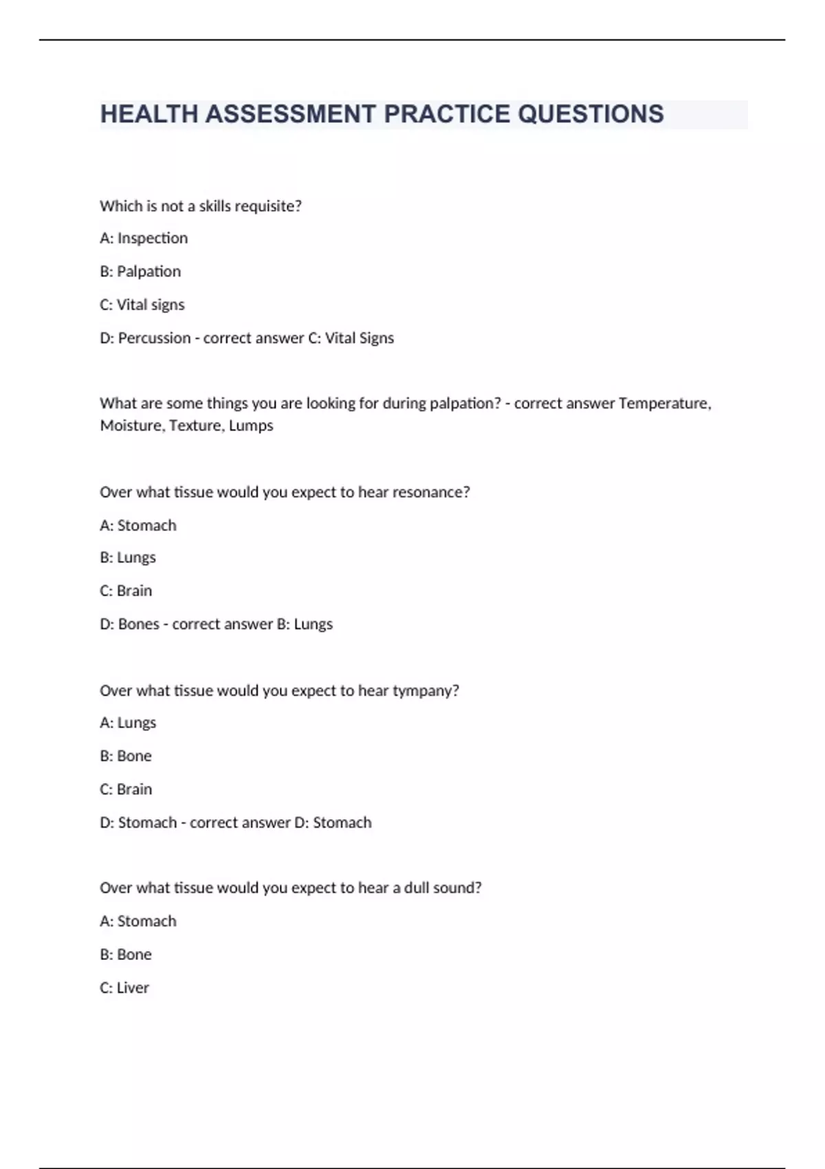 Which is not a skills requisite? A: Inspection B: Palpation C: Vital signs D: Percussion - correct answer C: Vital Signs What are some things you are looking for during palpation? - correct answer Temperature, Moisture, Texture, Lumps Over what tissue would you expect to hear resonance? A: Stomach B: Lungs C: Brain D: Bones - correct answer B: Lungs Over what tissue would you expect to hear tympany? A: Lungs B: Bone C: Brain D: Stomach - correct answer D: Stomach Over what tissue would you expect to hear a dull sound? A: Stomach B: Bone C: Liver D: Lungs - correct answer C: Liver Over what tissue would you expect to hear a flat sound? A: Lung B: Bone C: Muscle D: Stomach E: B&C - correct answer E: Bone & Muscle When is NOT best to use the diaphragm of the stethoscope? A: Heart murmur B: Breathing C: Bowl sounds D: High-pitched - correct answer A: Heart murmer How should you listen to heart and lung sounds? A: Over a gown B: Touching the skin - correct answer B: Touching the skin What position is correct for inserting a rectal suppository? A: Lithotomy B: Sims C: Dorsal Recumbent D: Supine - correct answer B: Sims Taking an axillary temperature on an adult will result in a temperature reading that is: A: One degree lower B: Accurate C: One degree higher D: Same as Oral - correct answer A: One degree lower What is a full & bounding pulse force? A: 3+ B: 2+ C: 1+ D: 0 - correct answer A: 3+ What is inversely related to blood pressure? A: Cardiac output B: Viscosity C: Elasticity D: Peripheral vascular resistance - correct answer C: Elasticity What category of blood pressure is 142/95? A: Normal B: Prehypertension C: Hypertension I D: Hypertension II - correct answer C: Hypertension I Which describes orthostatic blood pressure? A: A rise in systolic pressure by 10 mmHg B: A drop in Diastolic pressure by 10 mmHg C: A drop in systolic pressure by 10 mmHg D: A drop in diastolic pressure by 5 mmHg - correct answer B: A drop in diastolic pressure by 10 mmHg My blood pressure is 116/62. What is my pulse pressure? A: 20 B: 32 C: 63 D: 54 - correct answer D: 54 What is my cardiac output if my heart rate is 60bpm and my blood pressure is 120/72? A: 5.7L B: 6.1L C: 4.8L D: 5.0L - correct answer A: 5.7L At what phase would you hear muffling in Korotkoffs? A: Phase I B: Phase II C: Phase III D: Phase IV - correct answer D: Phase IV Which would not higher blood pressure? A: Anxiety B: Small cuff size C: Large cuff size D: Thigh blood pressure - correct answer C: Large cuff size What causes an auscultatory gap? A: Hypertension B: Arterial wall stiffness C: Both A&B D: Neither - correct answer C: Both A&B How should you take an infants temperature? A: Rectal B: Oral C: Axillary D: Temporal - correct answer C: Axillary What things should you look for during a health history? A: Physical Appearance B: Body Structure C: Mobility D: Behavior E: all of the above - correct answer E: ALl What percent of your diet should carbohydrates be? A: 40% B: 50% C: 60% D: 20% - correct answer B: 50% When does general survey begin? A: When you first look at the patient B: When you are looking through the patients chart C: After the meeting D: None of these - correct answer A: When you first look at the patient Which is not a primary lesion? A: Macule B: Papule C: Pustule D: Keloid - correct answer D: Keloid Which of the following do not go together? A: Macule & Patch B: Vesicle & Bulla C: Wheal & Cyst D: Nodule & Tumor - correct answer C: Wheal & Cyst What is a freckle an example of? A: Macule B: Papule C: Cyst D: Vesicle - correct answer A: Macule Which is related to shingles? A: Macule B: Vesicle C: Nodule D: Plaque - correct answer B: Vesicle Which is related to psoriasis? A: Plaque B: Patch C: Wheal D: Bulla - correct answer A: Plaque A patient comes in a has a crack in on his big toe. He tells you that he spends a lot of time doing yard work outside and is very sweaty. When you look at the crack it appears to travel into the dermis. It is most likely a: A: Scar B: Papule C: Keloid D: Fissure - correct answer D: Fissure A patient comes in with a spider angioma spot. This could indicate the patient has: A: Liver disease B: Diabetes C: Vitamin A Deficiency D: COPD - correct answer A: Liver disease A patient comes in with worry of edema. While assessing, you notice they show deep pitting that indents for a short time. This is: A: 1+ B: 2+ C: 3+ D: 4+ - correct answer C: 3+ A patient with edema would show what kind of turgor? A: Delayed B: Fast - correct answer B: Fast Which of the following is not a benign lesion? A: Freckles B: Cherry angioma C: Mongolian spot D: Malignant melanoma - correct answer D: Malignant melanoma A 56-year-old patient comes in with worry about her skin color change. She has noticed her hands have become a purple color. This would most likely be: A: Senile prupura B: Cherry angioma C: Spider angioma D: Bulla - correct answer A: Senile prupura What disease is associated with clubbing of the nails? A: Diabetes B: Hypothyroidism C: Pulmonary Disease D: Vitamin D deficiency - correct answer C: Pulmonary Disease ** Also cyanotic heart disease & lung cancer What would a capillary refill of more than 3 seconds indicated? A: Edema B: poor circulation C: inflammation D: Anxiety - correct answer B: poor circulation A patient with hyperthyroidism would have what type of hair? A: Dry B: Alopecia C: Blond D: Fine - correct answer D: Fine **Dry is hypo A patient is being assessed for their level of consciousness. When assessing their eyes, the patient only reacts to pain. What rating would this be? A: 4 B: 3 C: 2 D: 1 - correct answer C: 2 A patient is being assessed for their level of consciousness. When testing their motor responses, it is found the patient presents a Add to decerebrate pose. This is: A: Side lying B: Prone with elbows flexed C: Prone with elbows extended D: Supine - correct answer C: Prone with elbows extended What would the mini-mental state exam most likely test for? A: Substance abuse B: Anx
