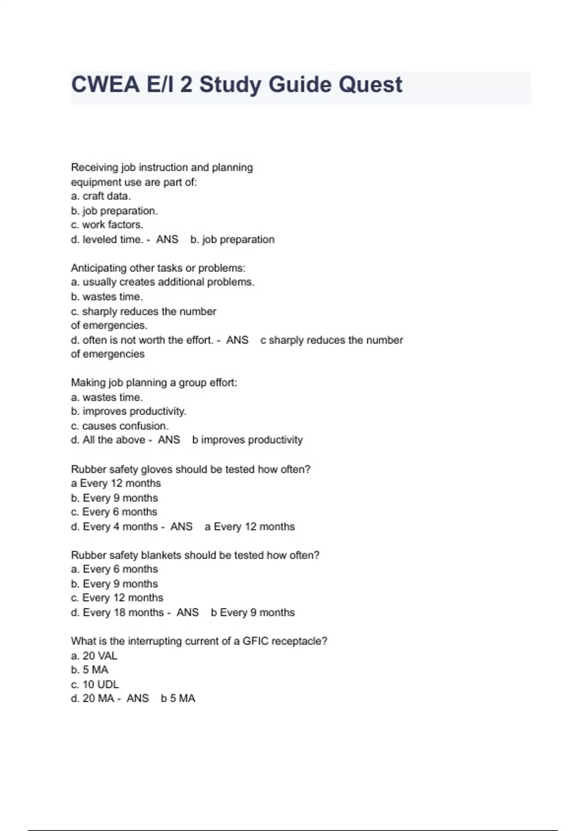 CWEA E/I 2 Study Guide Questions And Answers All Correct Receiving job instruction and planning equipment use are part of: a. craft data. b. job preparation. c. work factors. d. leveled time. - ANS b. job preparation Anticipating other tasks or problems: a. usually creates additional problems. b. wastes time. c. sharply reduces the number of emergencies. d. often is not worth the effort. - ANS c sharply reduces the number of emergencies Making job planning a group effort: a. wastes time. b. improves productivity. c. causes confusion. d. All the above - ANS b improves productivity Rubber safety gloves should be tested how often? a Every 12 months b. Every 9 months c. Every 6 months d. Every 4 months - ANS a Every 12 months Rubber safety blankets should be tested how often? a. Every 6 months b. Every 9 months c. Every 12 months d. Every 18 months - ANS b Every 9 months What is the interrupting current of a GFIC receptacle? a. 20 VAL b. 5 MA c. 10 UDL d. 20 MA - ANS b 5 MA What type of stepladder is forbidden while working on electrical equipment? a. Wood b. Fiberglass c. Aluminum d. Ceramic - ANS c Aluminum What is the killer of electrical shock? a. Voltage b. Current c. Resistance d. Ohms - ANS b Current The relationship between an electric current and a magnetic field is called: a. matter. b. atoms. c. electromagnetism. d. element - ANS c electromagnetism Electrons flowing from one place to another make a: a. current. b. track. c. circuit. d. channel - ANS a current Between two objects, the development of static charges creates a: a. potential difference. b. battery. c. thermocouple. d. resistance - ANS a potential difference A coil of wire that carries an electric current is called a: a. conductor. b. thermocouple. c. electrocurrent. d. electromagnet - ANS d electromagnet Metals are good conductors because they have many: a. insulators.
