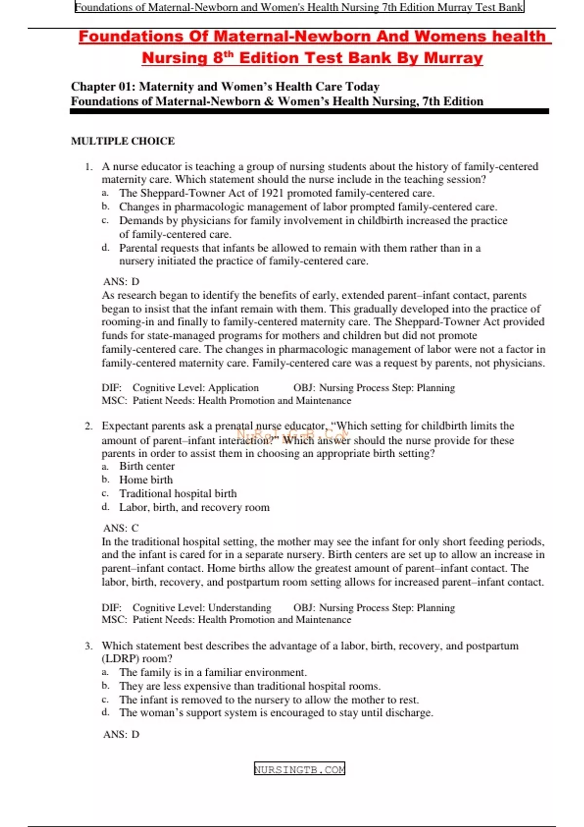 Foundations Of Maternal-Newborn And Womens health Nursing 8th Edition Test Bank By Murray