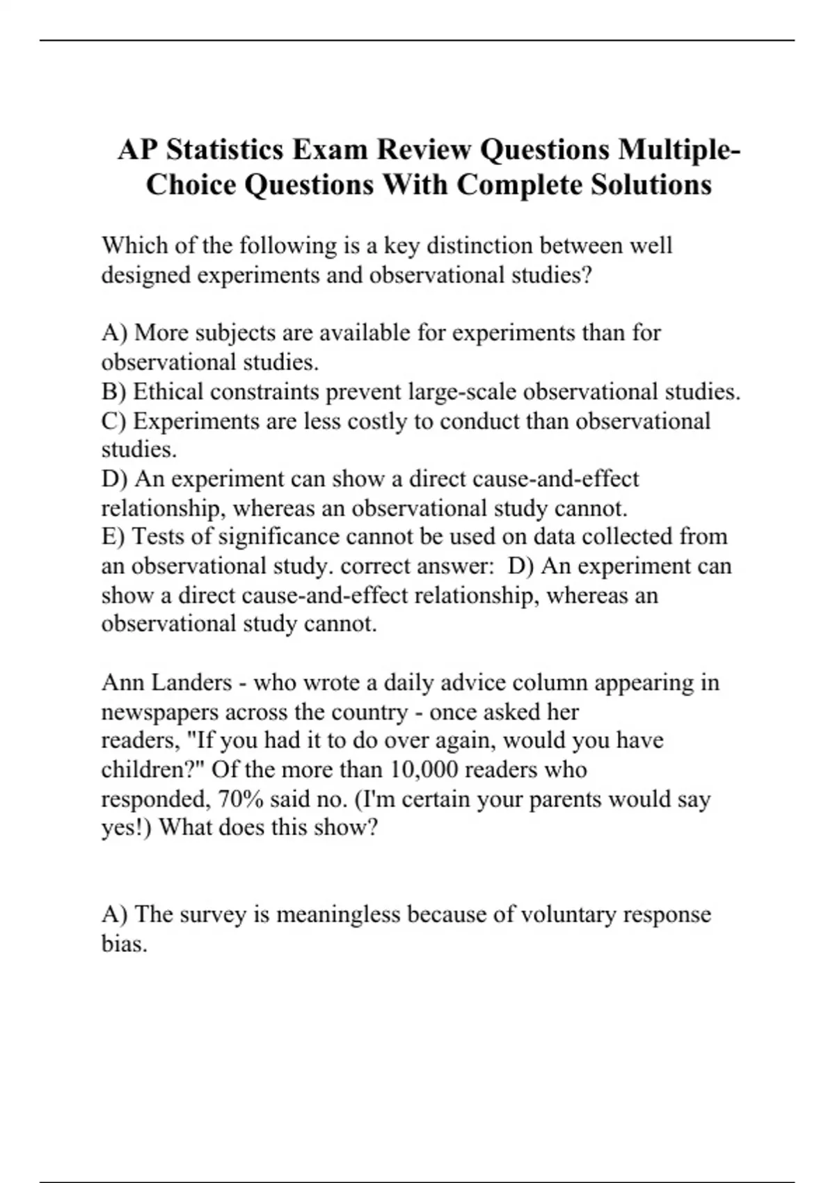 AP Statistics Exam Review Questions Multiple-Choice Questions With Complete Solutions