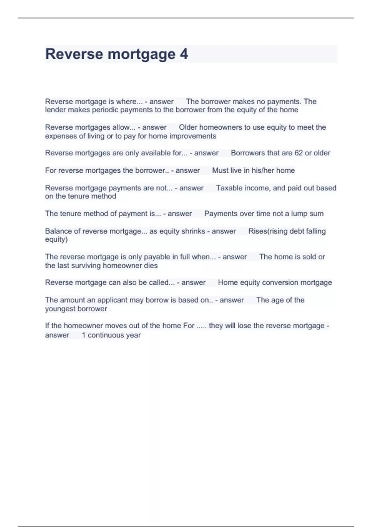 Reverse mortgage 4 Questions and Answers fully solved