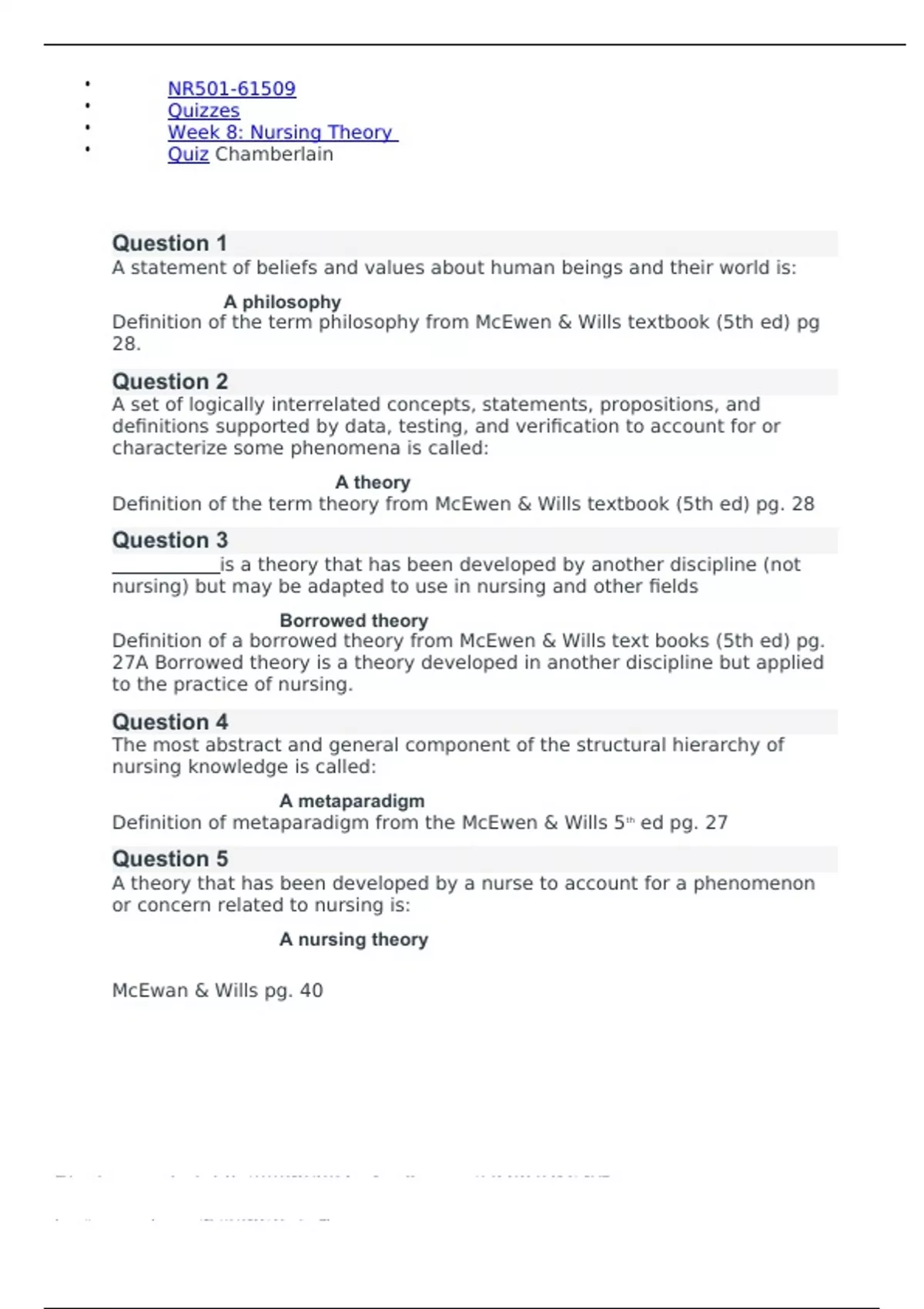 Question 1 A statement of beliefs and values about human beings and their world is: A philosophy Definition of the term philosophy from McEwen & Wills textbook (5th ed) pg 28. Question 2 A set of logically interrelated concepts, statements, propositions, and definitions supported by data, testing, and verification to account for or characterize some phenomena is called: A theory Definition of the term theory from McEwen & Wills textbook (5th ed) pg. 28 Question 3 is a theory that has been developed by another discipline (not nursing) but may be adapted to use in nursing and other fields Borrowed theory Definition of a borrowed theory from McEwen & Wills text books (5th ed) pg. 27A Borrowed theory is a theory developed in another discipline but applied to the practice of nursing. Question 4 The most abstract and general component of the structural hierarchy of nursing knowledge is called: A metaparadigm Definition of metaparadigm from the McEwen & Wills 5th ed pg. 27 Question 5 A theory that has been developed by a nurse to account for a phenomenon or concern related to nursing is: A nursing theory McEwan & Wills pg. 40 The nursing paradigm identifies four concepts of interest to the nursing profession. These four concepts are: The person, health, environment/situation, and nursing Description, explanation, prediction, and prescription of an interrelationship of nursing McEwen & Wills (5th ed) pgs. 41-44 A group of theories that are broad in scope, complex, and provide broad and abstract views about nursing are called: A grand theory McEwen & Wills 5th ed pg. 37 & chap. 6 A group of theories that are more limited in scope, less abstract, reflect practice, and addresses a specific phenomenon are called: A middle range theory McEwen & Wills (5th ed) pgs. 37-38 & Chap. 10 A central construct in nursing would be: Caring What do the following theories written by Watson, Swanson, Duffy, Boykin & Schoenhofer, and Hall have in common? They focus on care and caring An example of a nursing theory would be: Benner's Novice to Expert theory True or False: Concepts are words or phrases that refer to or describe a phenomenon. True Concepts are terms that refer to or describe phenomena that occur in nature or thought. Nursing theory influences nursing practice by: Specifying actions or interventions to be provided Which type of nursing practice theory would a nurse be more likely to choose to manage specific situations or issues in the practice setting? Mercer’s Maternal Role Attainment theory Ruland & Morre’s Peaceful End of Life theory Lorig’s Chronic Disease Self-Management theory McEwen & Wills (5th ed) pg. 38 The nurse is caring for a client who is struggling with increased intracranial pressure. The nurse makes sure the client has water to drink, has voided recently, and the room is quiet and dark. Which theory is demonstrated here? Henderson's need theory Match the nursing theorist to their nursing theory. Self-care defecit Focus on interpersonal relationships Focus on goal attainment Focus on humanistic science of nursing