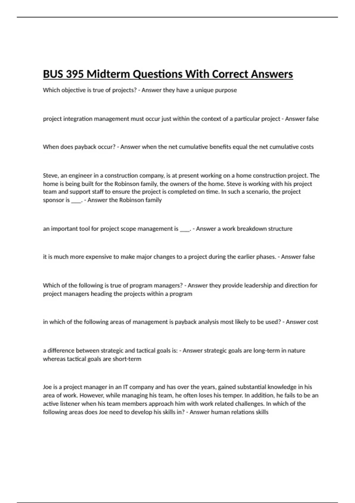 Which objective is true of projects? - Answer they have a unique purpose project integration management must occur just within the context of a particular project - Answer false When does payback occur? - Answer when the net cumulative benefits equal the net cumulative costs Steve, an engineer in a construction company, is at present working on a home construction project. The home is being built for the Robinson family, the owners of the home. Steve is working with his project team and support staff to ensure the project is completed on time. In such a scenario, the project sponsor is ___. - Answer the Robinson family an important tool for project scope management is ___. - Answer a work breakdown structure it is much more expensive to make major changes to a project during the earlier phases. - Answer false Which of the following is true of program managers? - Answer they provide leadership and direction for project managers heading the projects within a program in which of the following areas of management is payback analysis most likely to be used? - Answer cost a difference between strategic and tactical goals is: - Answer strategic goals are long-term in nature whereas tactical goals are short-term Joe is a project manager in an IT company and has over the years, gained substantial knowledge in his area of work. However, while managing his team, he often loses his temper. In addition, he fails to be an active listener when his team members approach him with work related challenges. In which of the following areas does Joe need to develop his skills in? - Answer human relations skills A ___ is an organizational group responsible for coordinating the project management function throughout an organization. - Answer project management office Which of the following refers to a set of principles that guides decision making based on personal values of what is considered right and wrong? - Answer ethics Which problem-solving approach requires defining the scope of a system, dividing it into its components, and then identifying and evaluating its problems, opportunities, constraints, and needs? - Answer systems analysis Which perspective of an organization focuses on different groups' roles and responsibilities in order to meet the goals and policies set by top management? - Answer structural frame a ___ is usually not necessary to the Scrum method, because Scrum implies that team members work as a self-directed group. - Answer team charter Grey's Infotech sells customized hardware and software solutions for businesses. The salespeople for Grey's have a strict dress code when meeting clients. They are required to wear dark business suits, in order to convey the company's dedication to quality. The meaning conveyed to the clients' through the salespeople's clothing is part of the ___ frame of the organization. - Answer symbolic